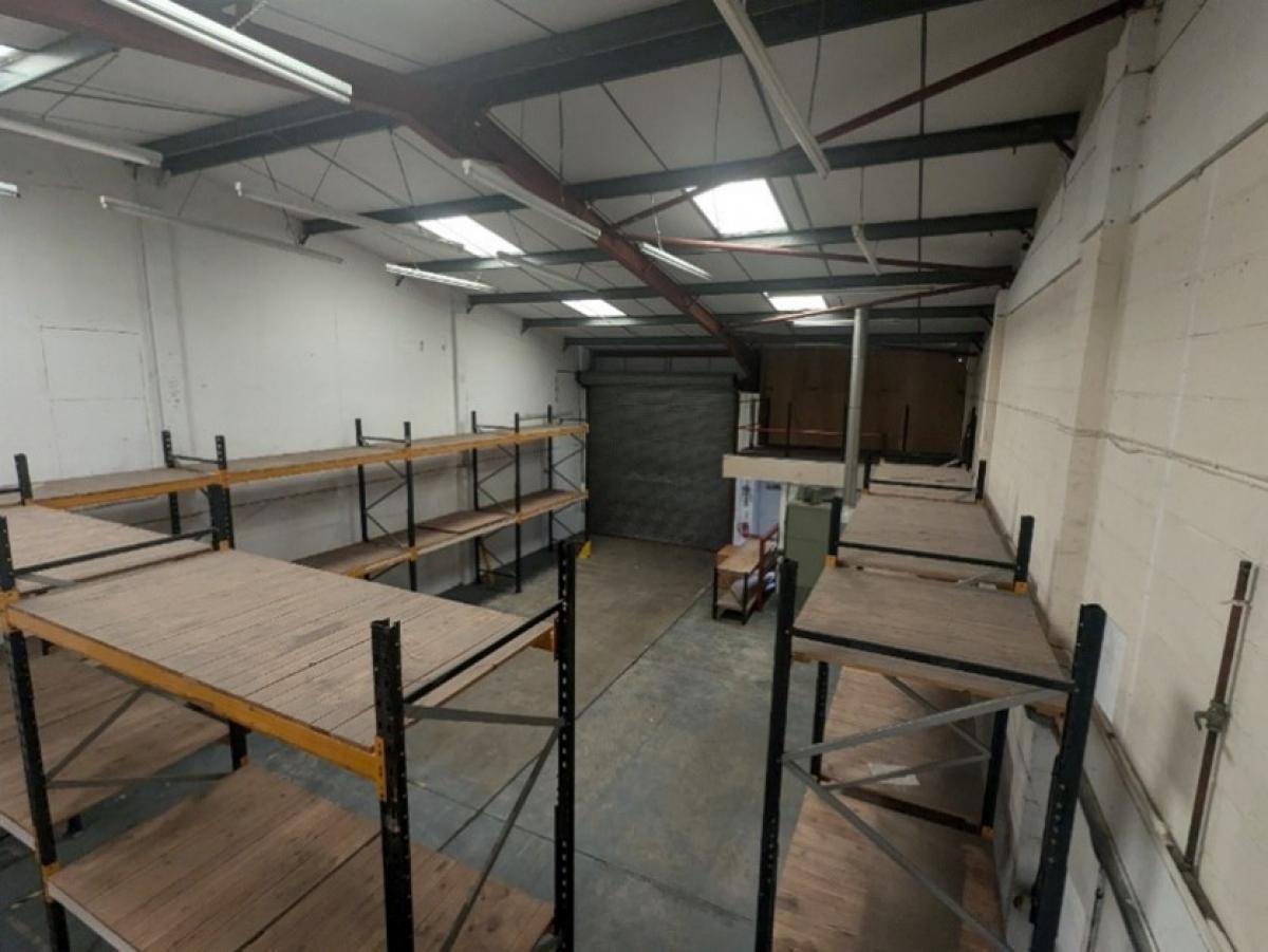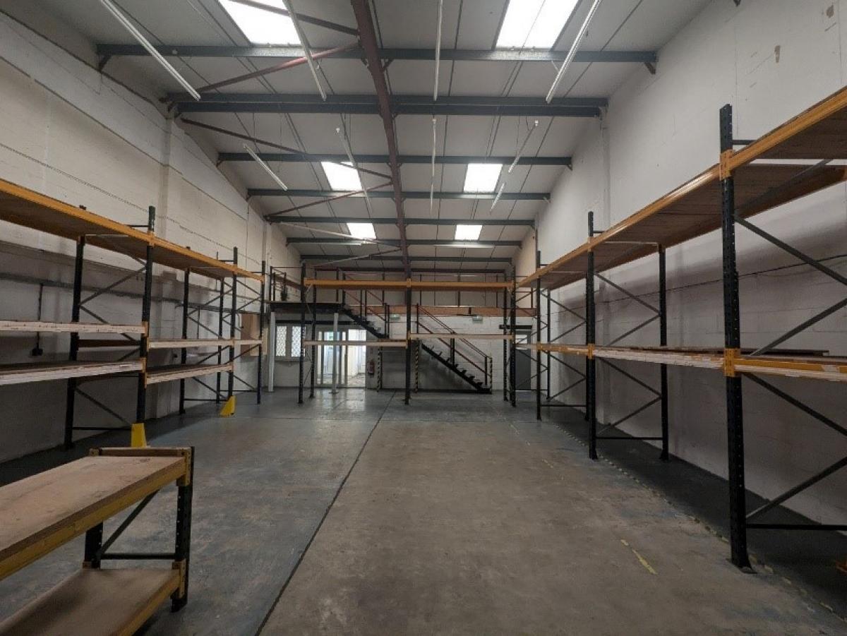 A mid-terrace industrial/warehouse unit of steel portal frame and brick and block construction, under a pitched profile steel roof. Internally, the unit features a large industrial/warehouse space with mezzanine storage and rear-loading door access. In addition to office accommodation and WC/kitchen facilities to the front.