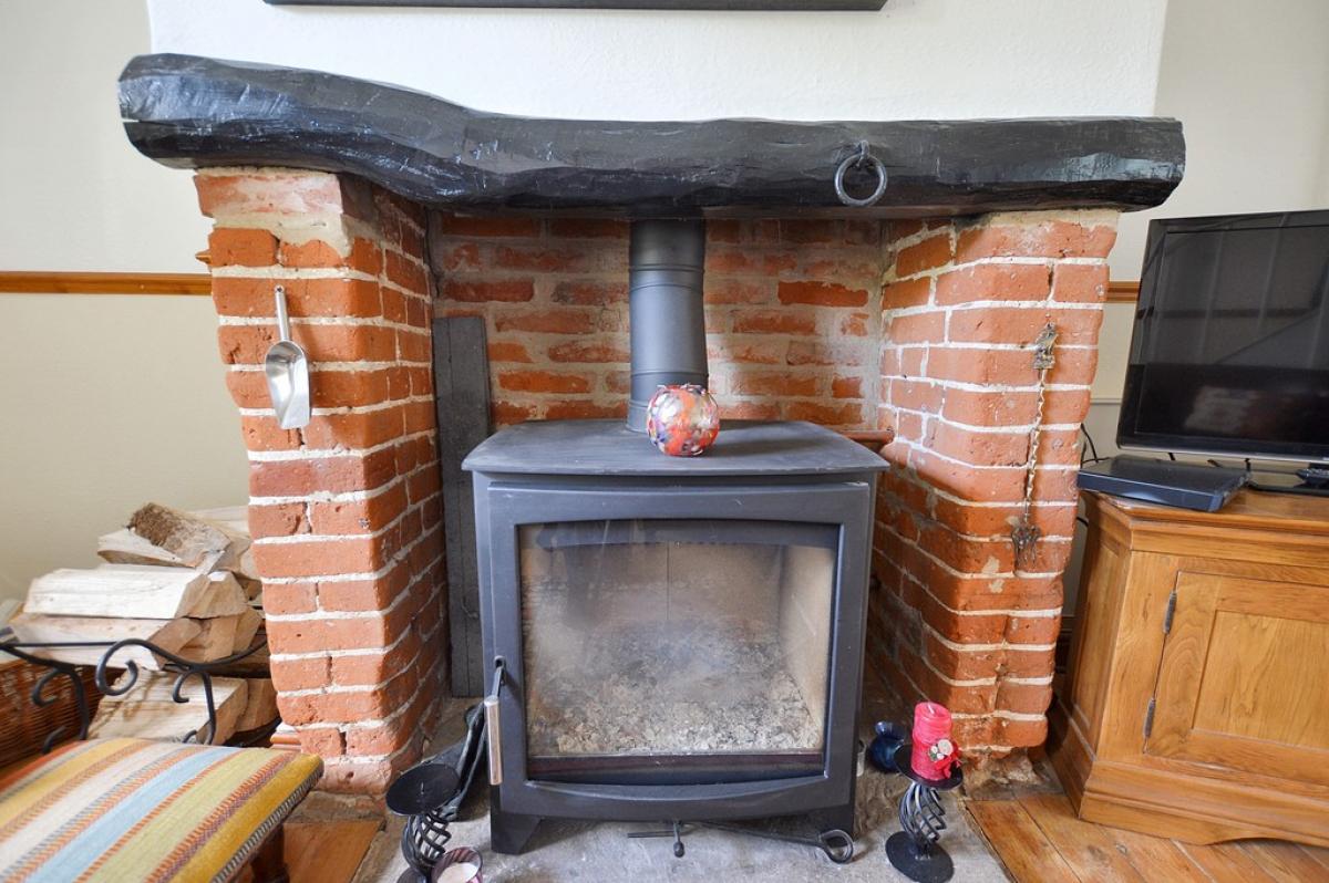 SITTINGROOM With windows and part glazed door to front aspect, door to kitchen. Feature redbrick fireplace housing large wood burning stove. Polished wood floor, two radiators, provision for TV, turning staircase to first floor with understairs recess.