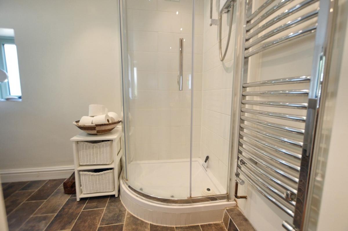 SHOWERROOM Corner shower enclosure with electric independent shower, pedestal wash basin, close coupled w.c., chrome heated towel rail/radiator, two windows to side and rear.