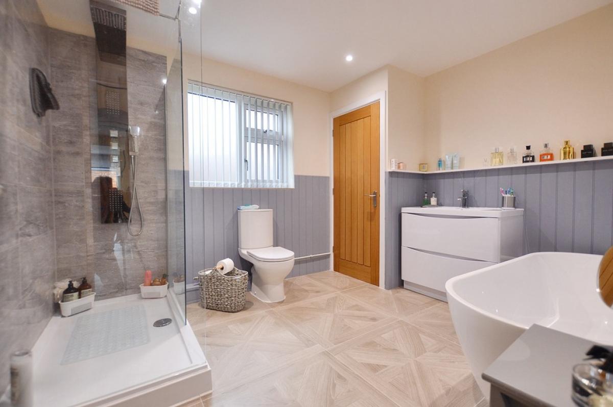 BATHROOM Luxuriously fitted with level entry double width shower with glazed screen and mixer shower with spray and drench heads. Close coupled w.c. vanity wash basin with drawers beneath, free standing bath with central mixer tap, radiator, part panelled walls, tiled floor, window to side aspect, built in airing cupboard.