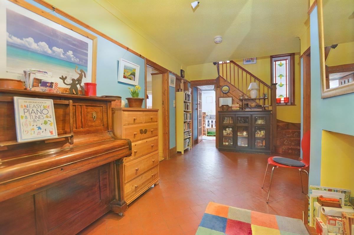 RECEPTIONHALL Original polished tiled floor, fireplace recess with original tiled hearth, turning staircase to first floor.