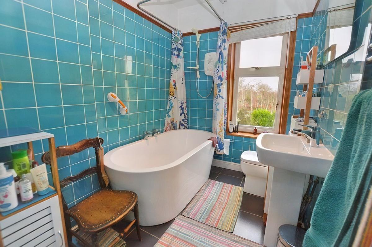 FAMILYBATHROOM Corner bath with electric shower above and tiled splash backs, vanity washbasin with cupboards beneath, close coupled w.c., wall tiling, window to rear aspect.