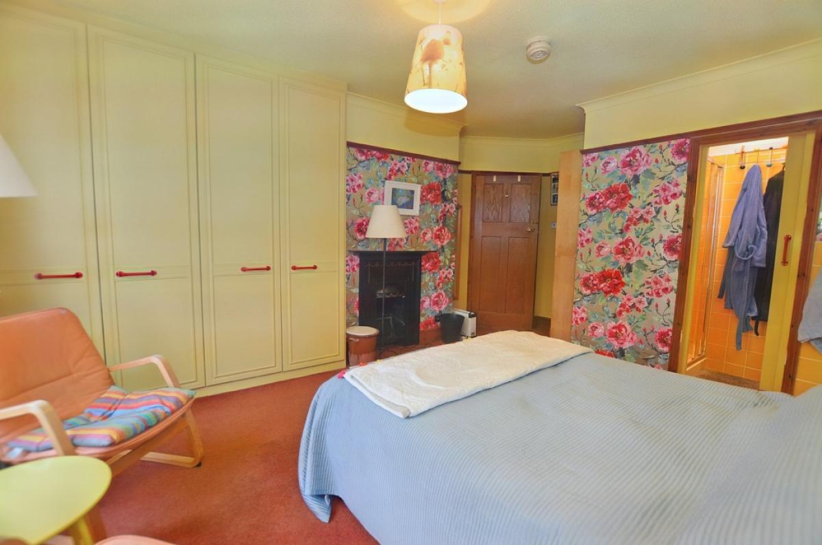 BEDROOM1 Another light room with dual aspect windows, radiator, period fireplace, triple fitted wardrobe cupboard. Door to: