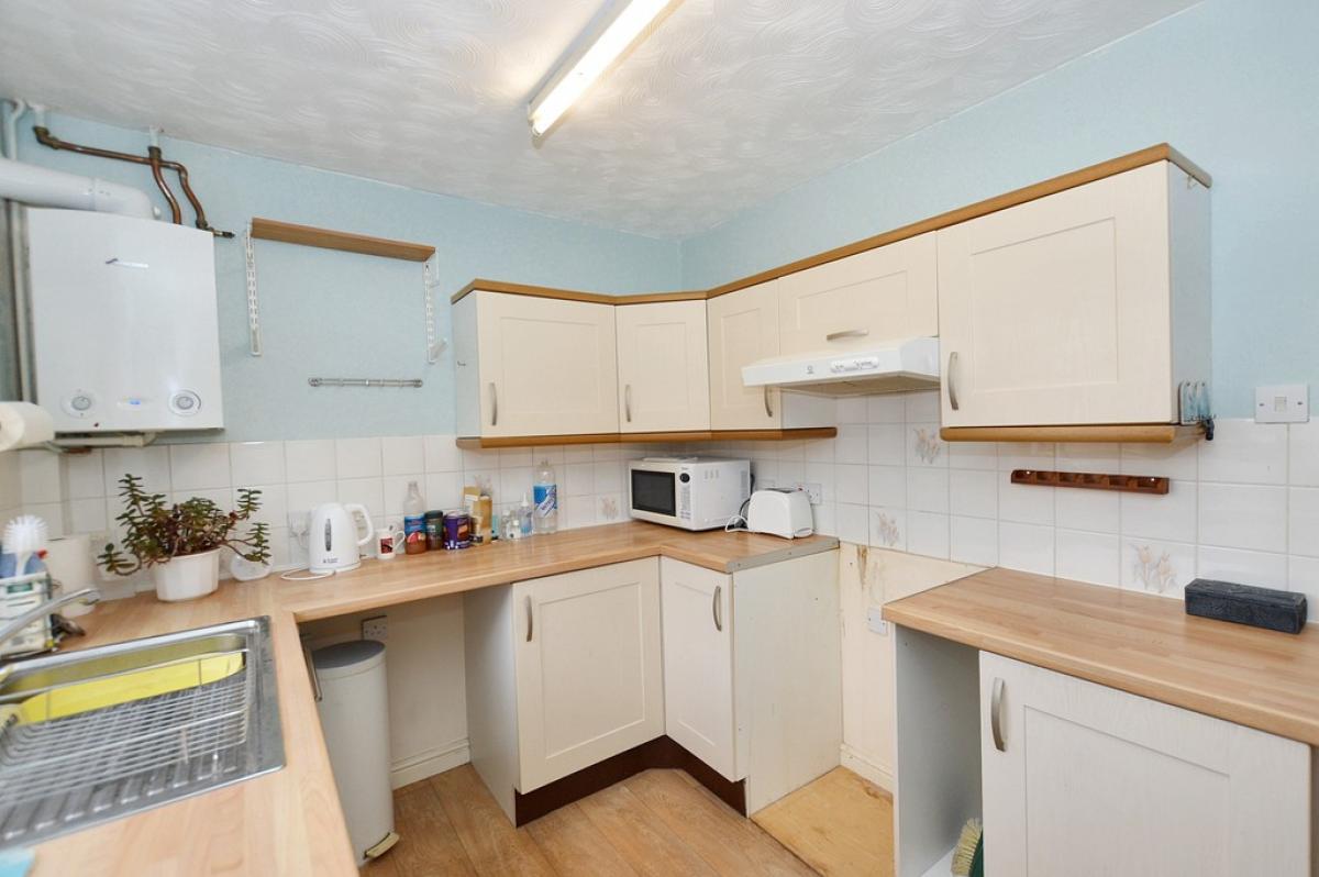 KITCHEN Comprehensive range of base and wall cabinets with laminated work surfaces and tiled splashbacks, inset stainless steel sink unit, provision for washing machine, provision for gas or electric cooker with filter hood above, space for under-counter refrigerator, wall mounted gas boiler providing central heating and domestic hot water, radiator, window and glazed door to side aspect.