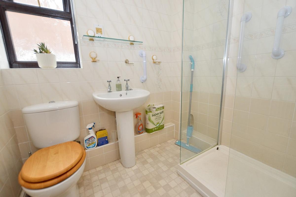 SHOWERROOM Level entry shower enclosure with electric power shower and glazed screen. Pedestal wash basin, close coupled w.c., radiator, fully tiled walls, window to side aspect.