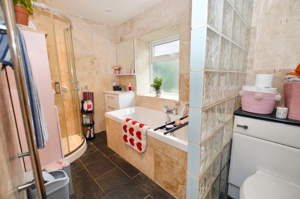 BATHROOM Panelled bath with central mixer tap, vanity wash basin with drawers beneath, corner shower enclosure, glass block partition, concealed cistern w.c., tiled walls and floor, chrome heated towel rail.