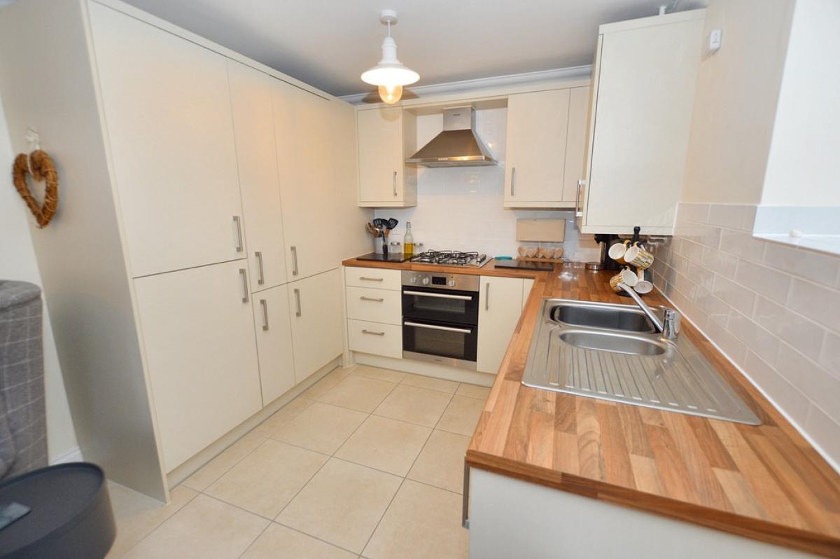 KITCHEN Comprehensive range of high gloss base and wall cupboards (additional cupboards installed since construction) with laminated work surfaces incorporating double bowl stainless steel sink unit, inset four ring gas hob with electric double oven beneath, tiled splashbacks, integrated washing machine, fridge/freezer. Wall mounted gas fired boiler providing central heating and domestic hot water.