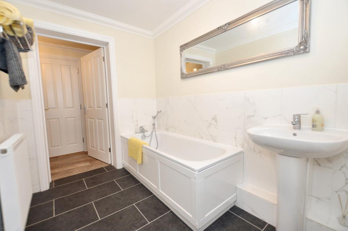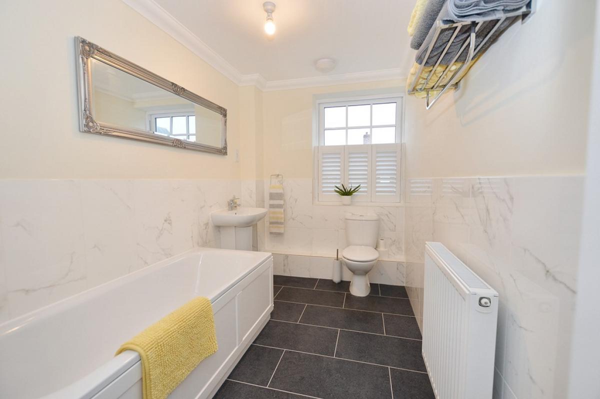 BATHROOM Contemporary suite of panelled bath with mixer tap and shower attachment, pedestal wash basin, close coupled w.c., tiled floor and part tiled walls, fitted wooden venetian blind to window. Radiator.