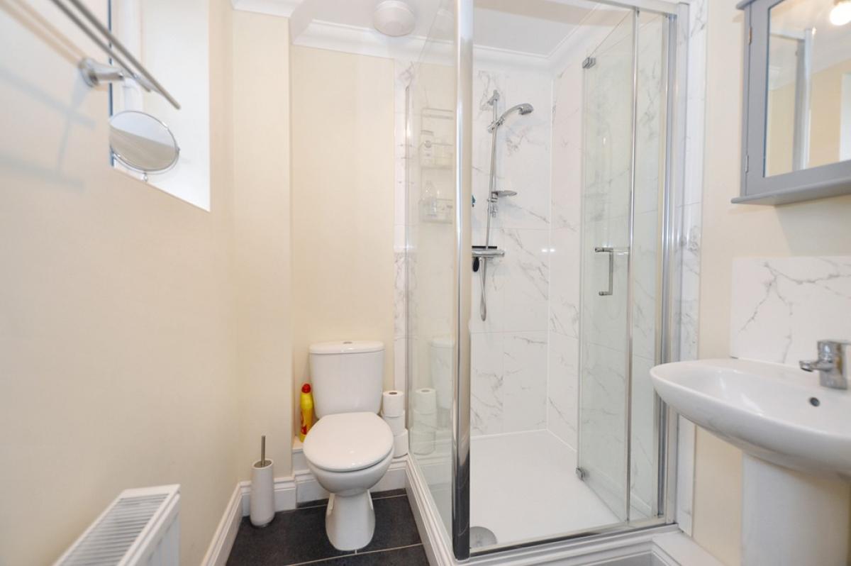 ENSUITE Corner shower enclosure with mixer shower, close coupled w.c., pedestal wash basin, window to rear, tiled floor and splashbacks.