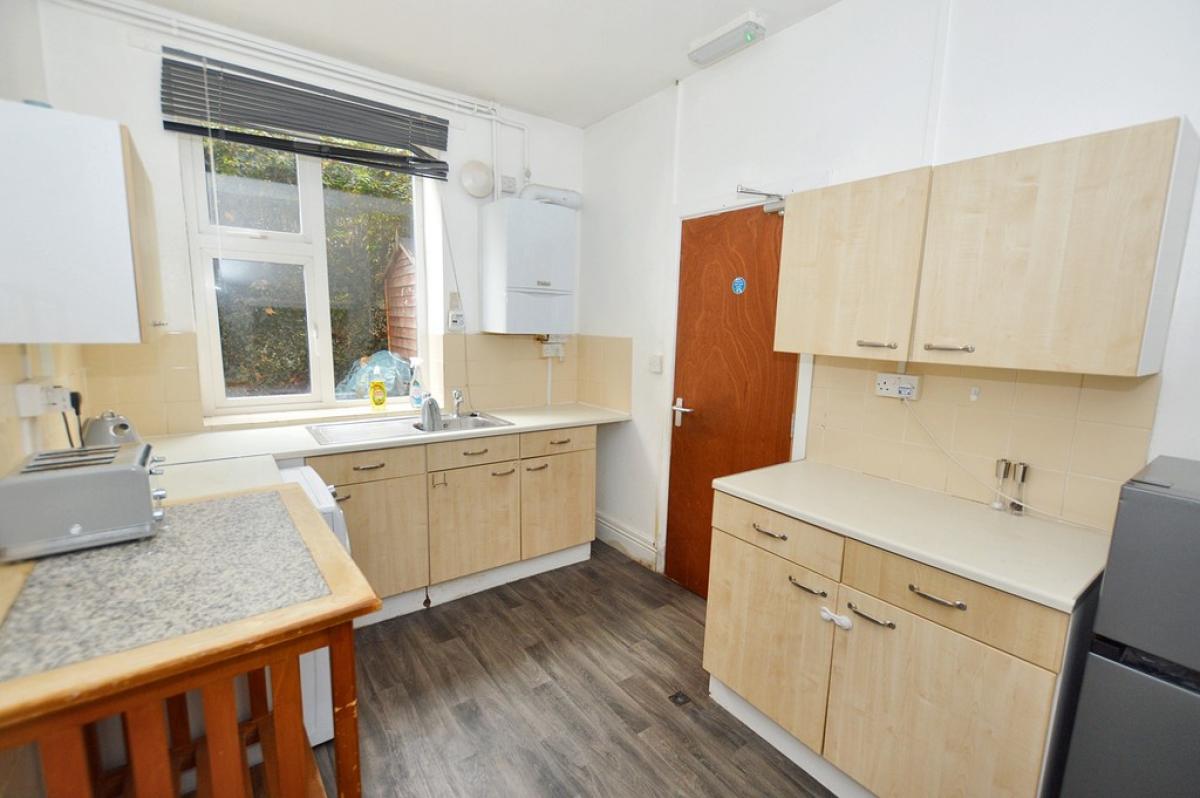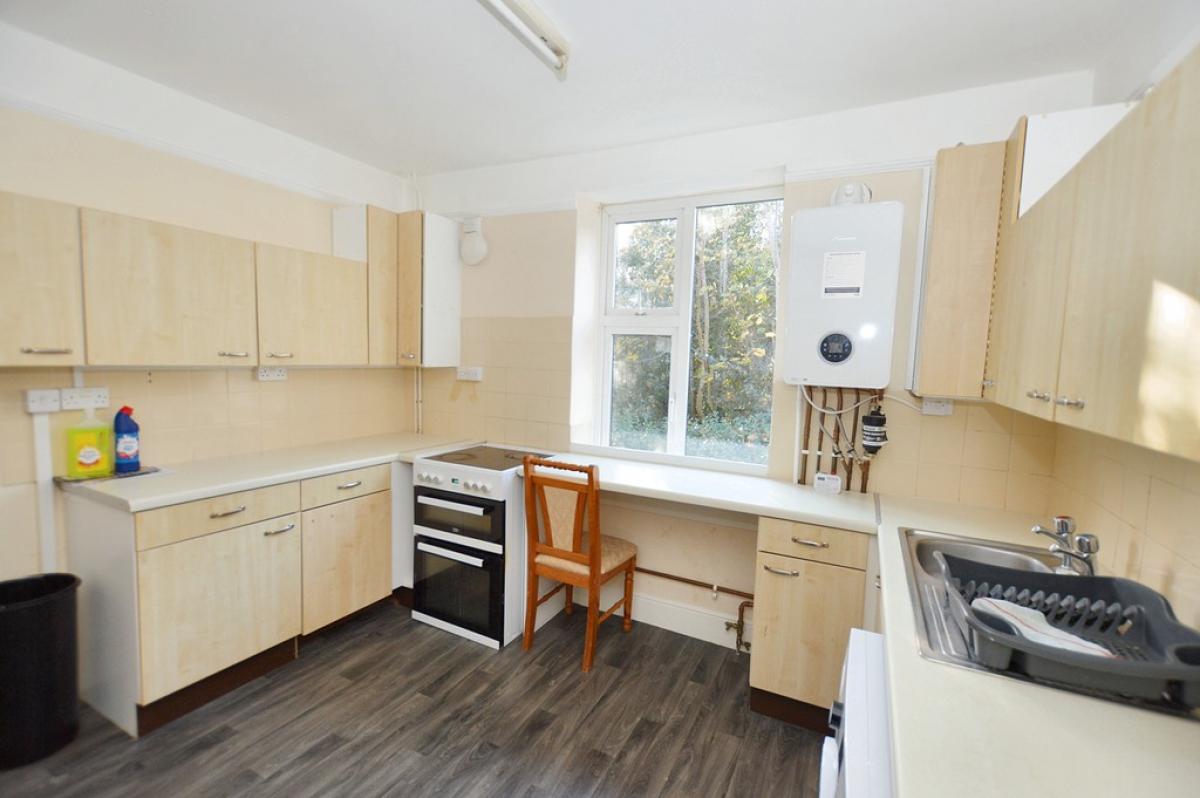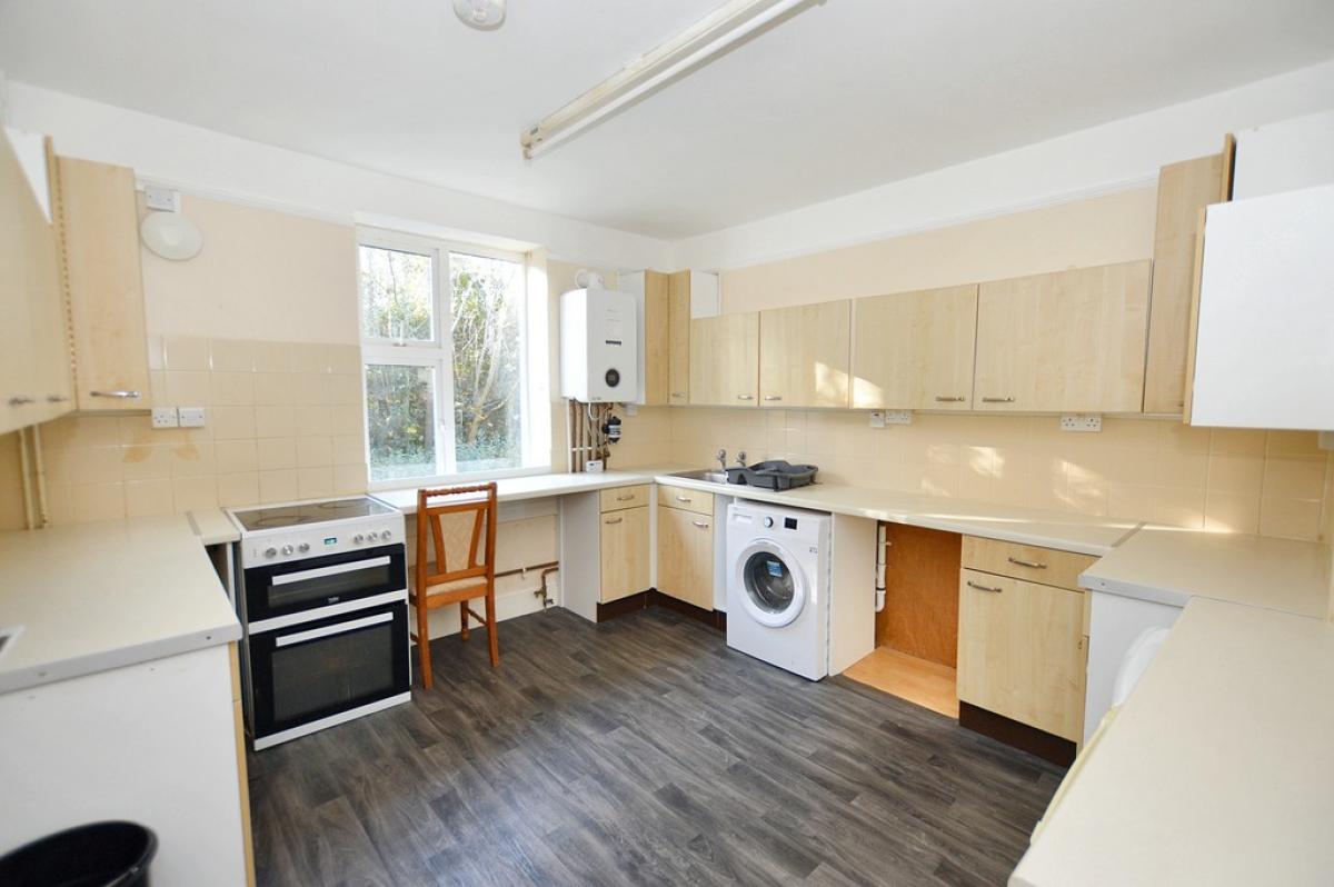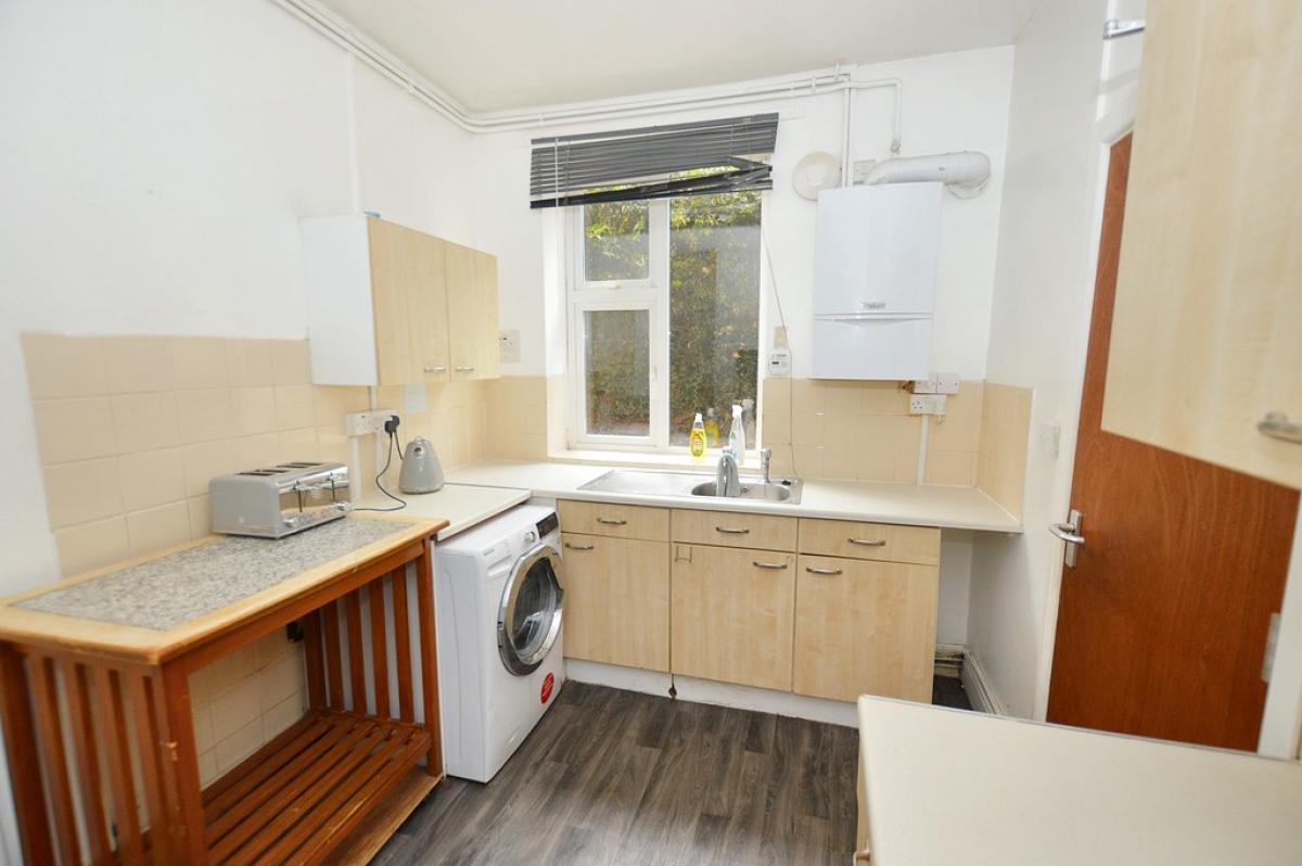 KITCHEN Comprehensive range of base and wall cupboards with laminated work surfaces and tiled splashbacks, provision for washing machine and point for electric cooker, wall mounted gas boiler providing central heating and hot water for the maisonette, window to side aspect.