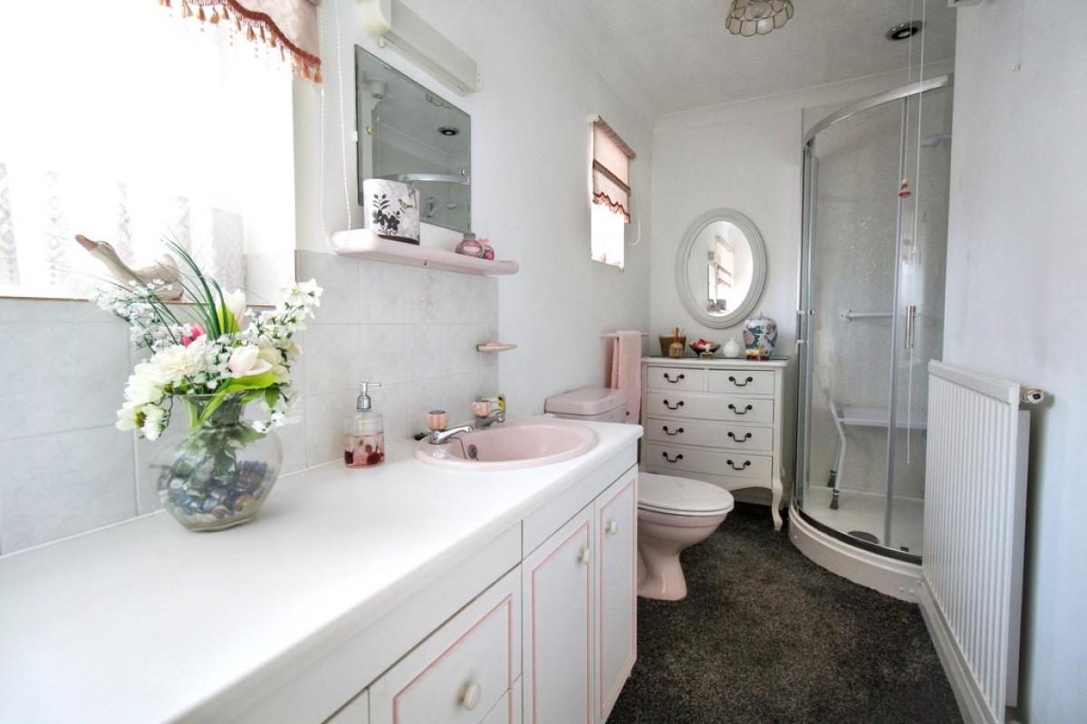 SHOWER ROOM Two double glazed windows to side aspect, WC, corner shower cubicle with electric Triton shower, vanity unit with wash hand basin, WC, carpet, radiator.