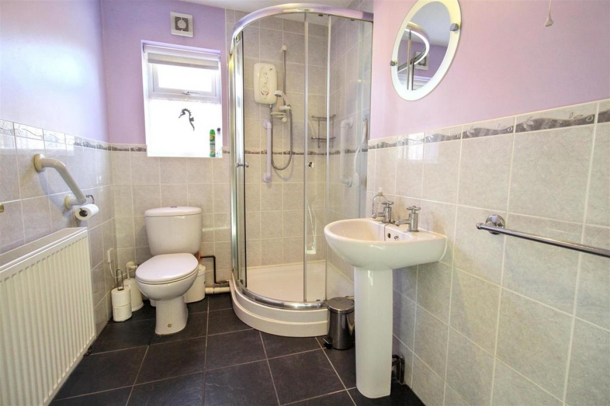 SHOWERROOM Double glazed window with obscured glass to side aspect, fitted with corner cubicle with electric Mira shower, WC, pedestal wash hand basin, tiled flooring, radiator, extractor fan.