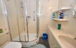 SHOWERROOM Vanity wash basin with cupboard beneath, close coupled w.c., extractor fan, electric shaver point and light, heated towel rail, shower cubicle with mixer shower and sliding screen, tiled walls.