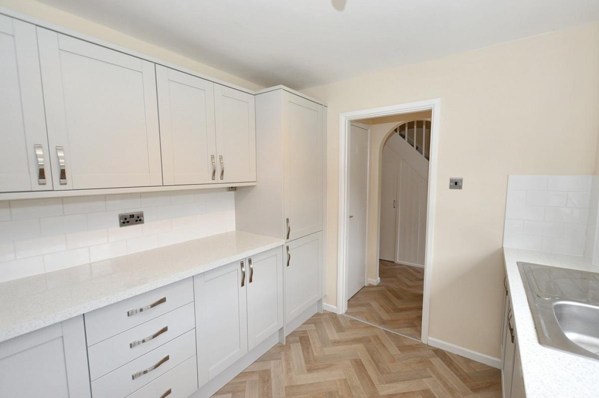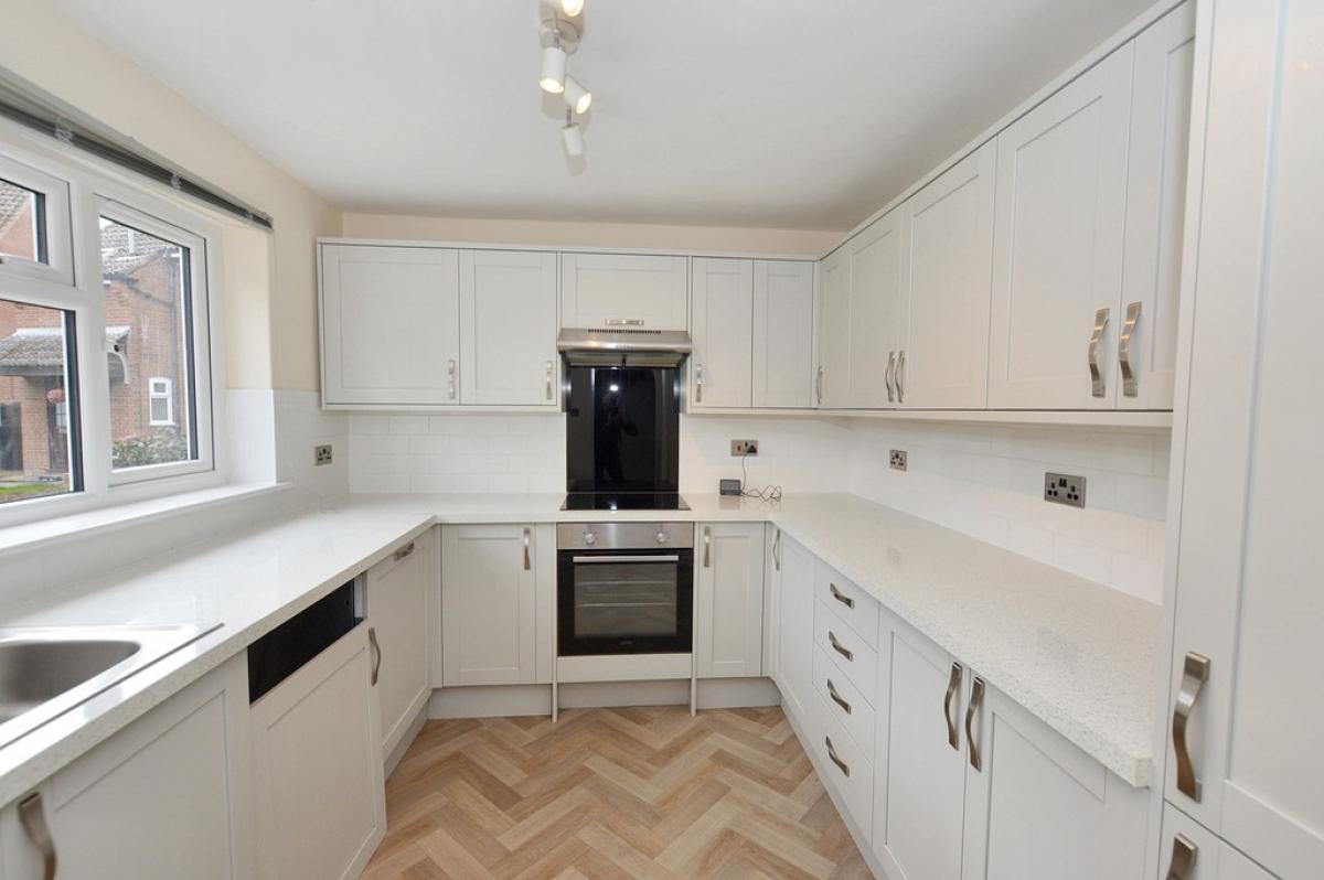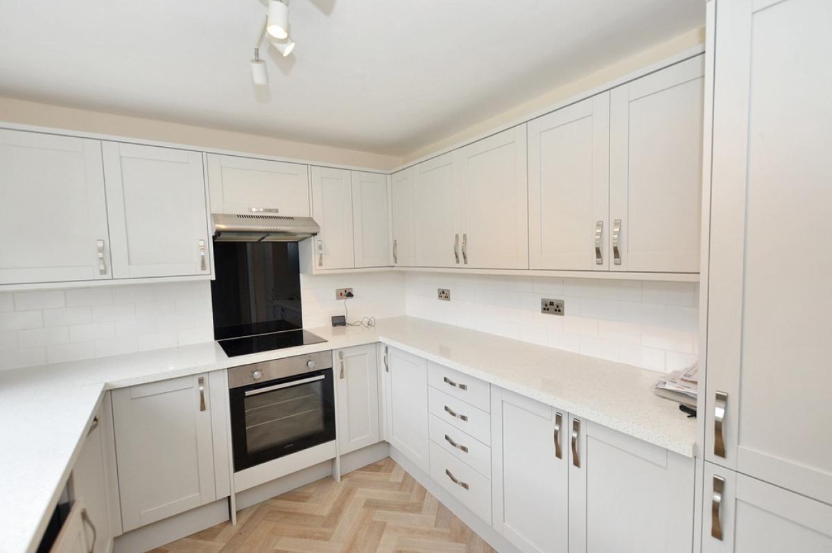 KITCHEN Re-fitted with a range of shaker-style base and wall cabinets with laminated work surfaces and tiled splashbacks. Inset electric hob with filter hood above and electric oven beneath, inset stainless steel sink unit, integrated dishwasher, provision for integrated washing machine, integrated fridge/freezer.