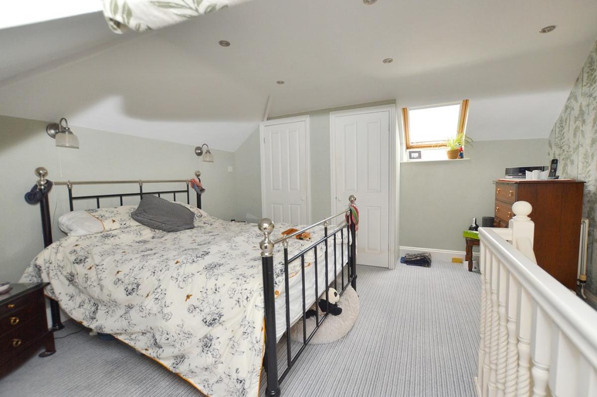 PRINCIPALBEDROOM UPVC double glazed window to the rear aspect. Two large built in wardrobe/cupboards, carpet, two wall light points, velux roof light, door to: