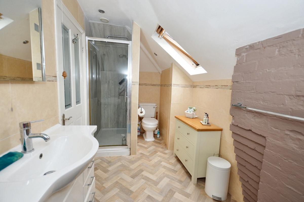 ENSUITESHOWERROOM Velux roof light, wall mounted heated towel rail, low level WC, vanity wash basin with storage cupboard and drawers beneath and mirror/light above. Enclosed shower cubicle with glazed door, vinyl flooring, LED spot lighting.