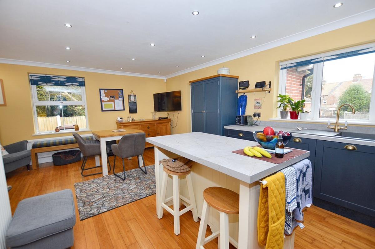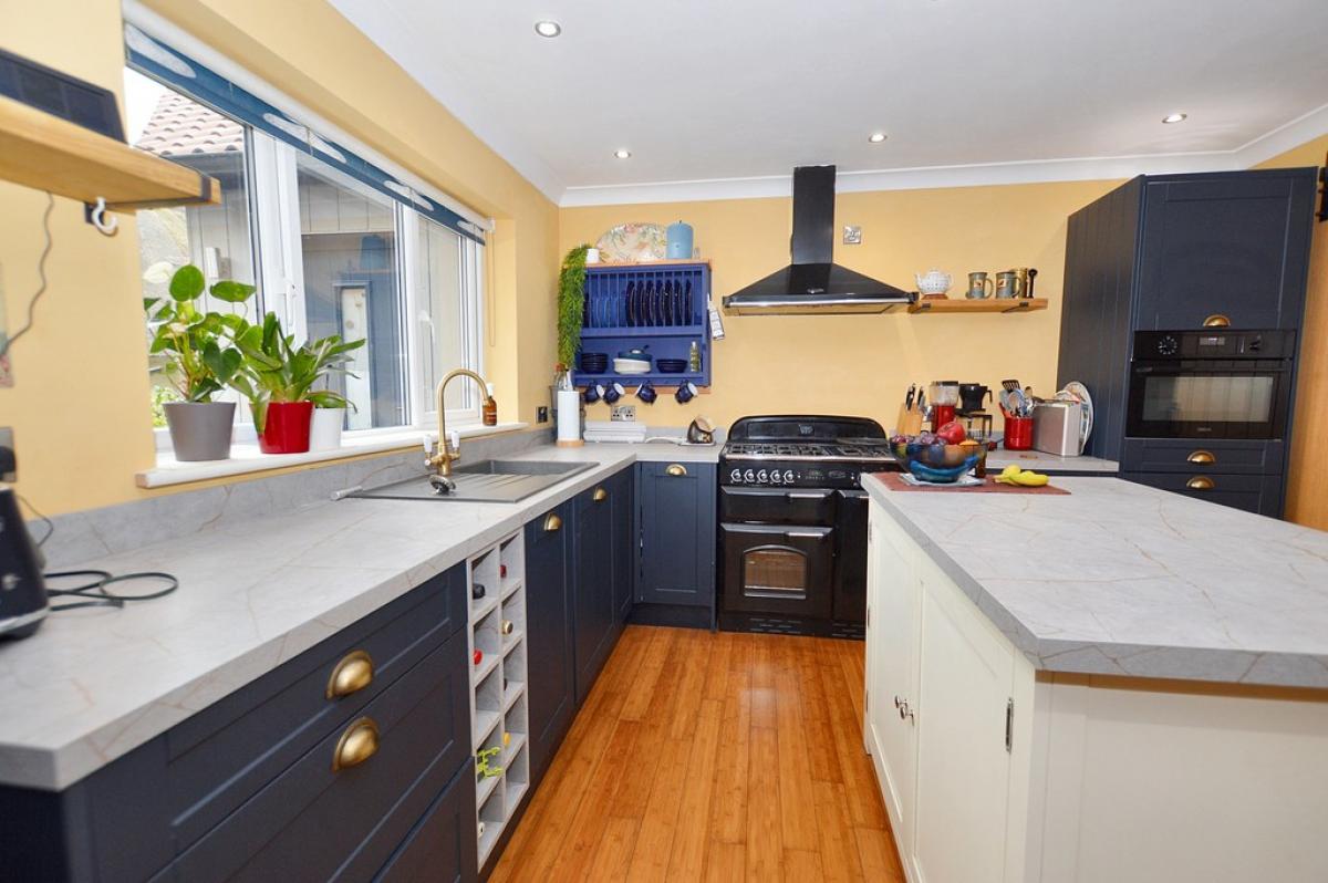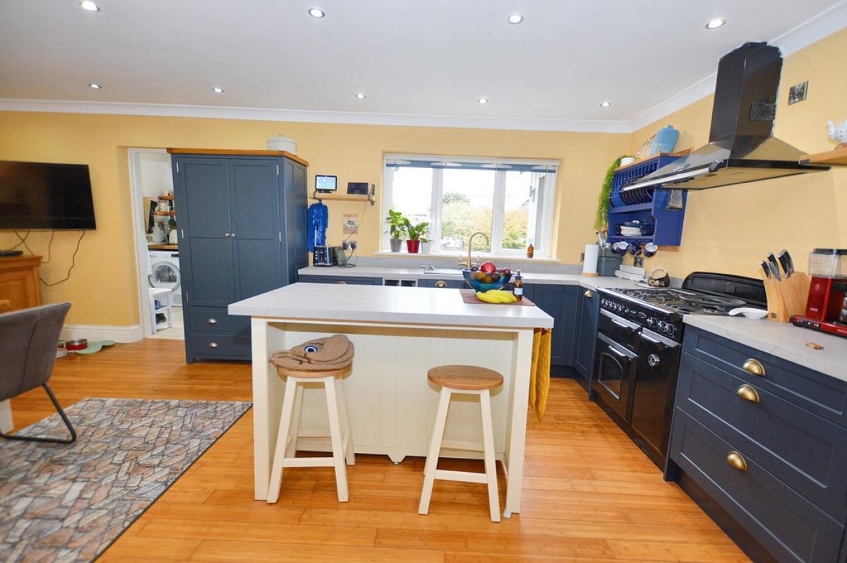 KITCHEN/DININGROOM A great space for entertaining with a modern kitchen in Stiffkey blue, base and drawer units, with marbled quartz work surface over, inset single bowl sink unit with mixer tap, wine storage unit, built in microwave, free standing Range master cooker, central island with storage cupboard and shelving beneath, wood flooring. UPVC double glazed window to the front and side. Solid wood sliding barn door, TV point, column radiator, LED spot lighting, lovely family area with feature cast iron open fire place on marble hearth. Door to: