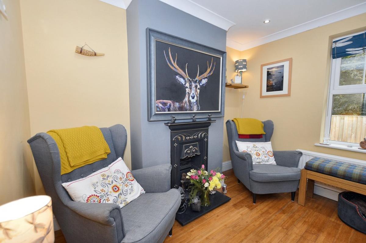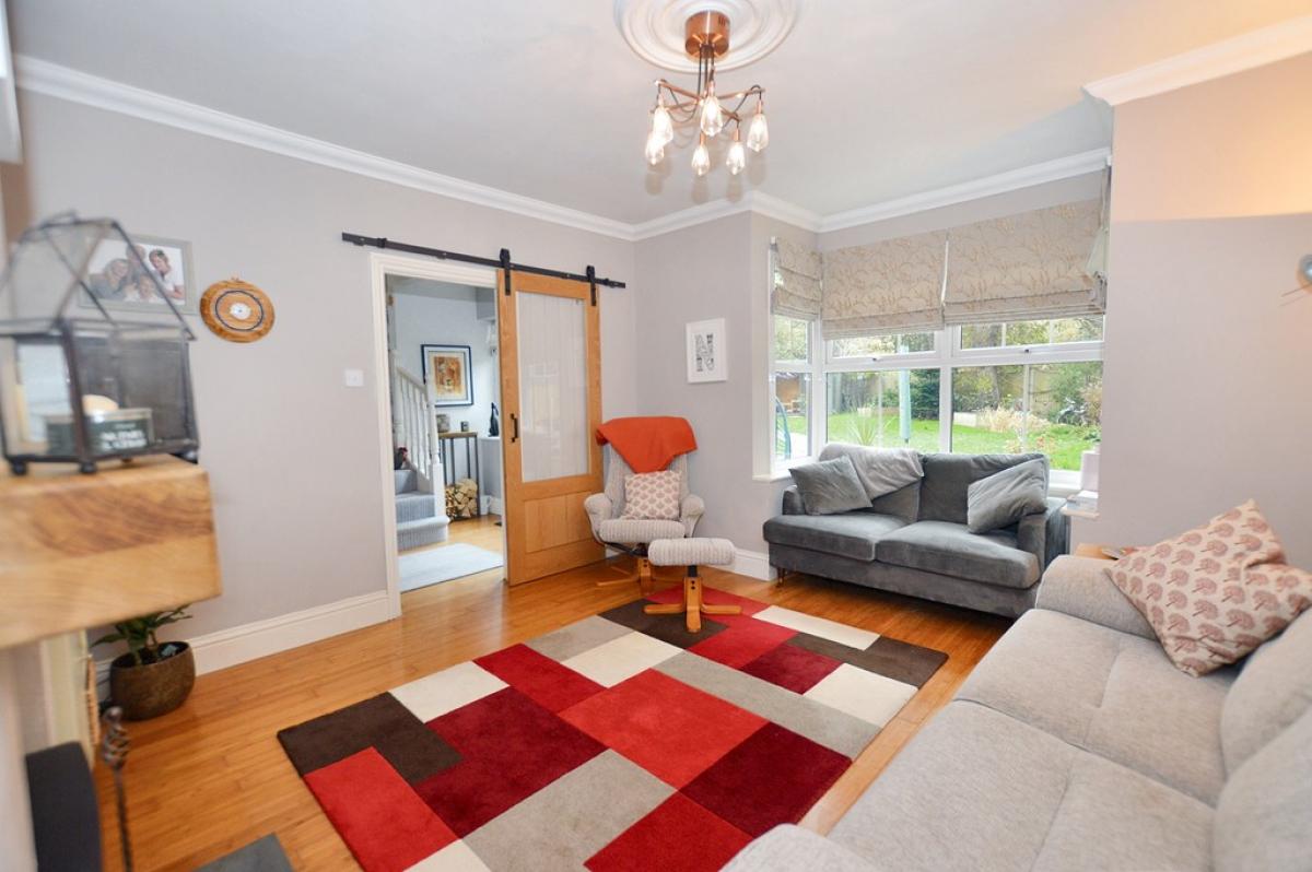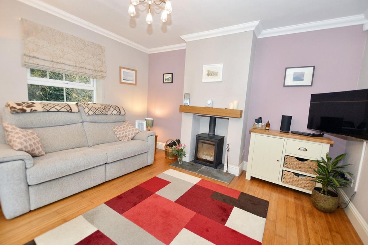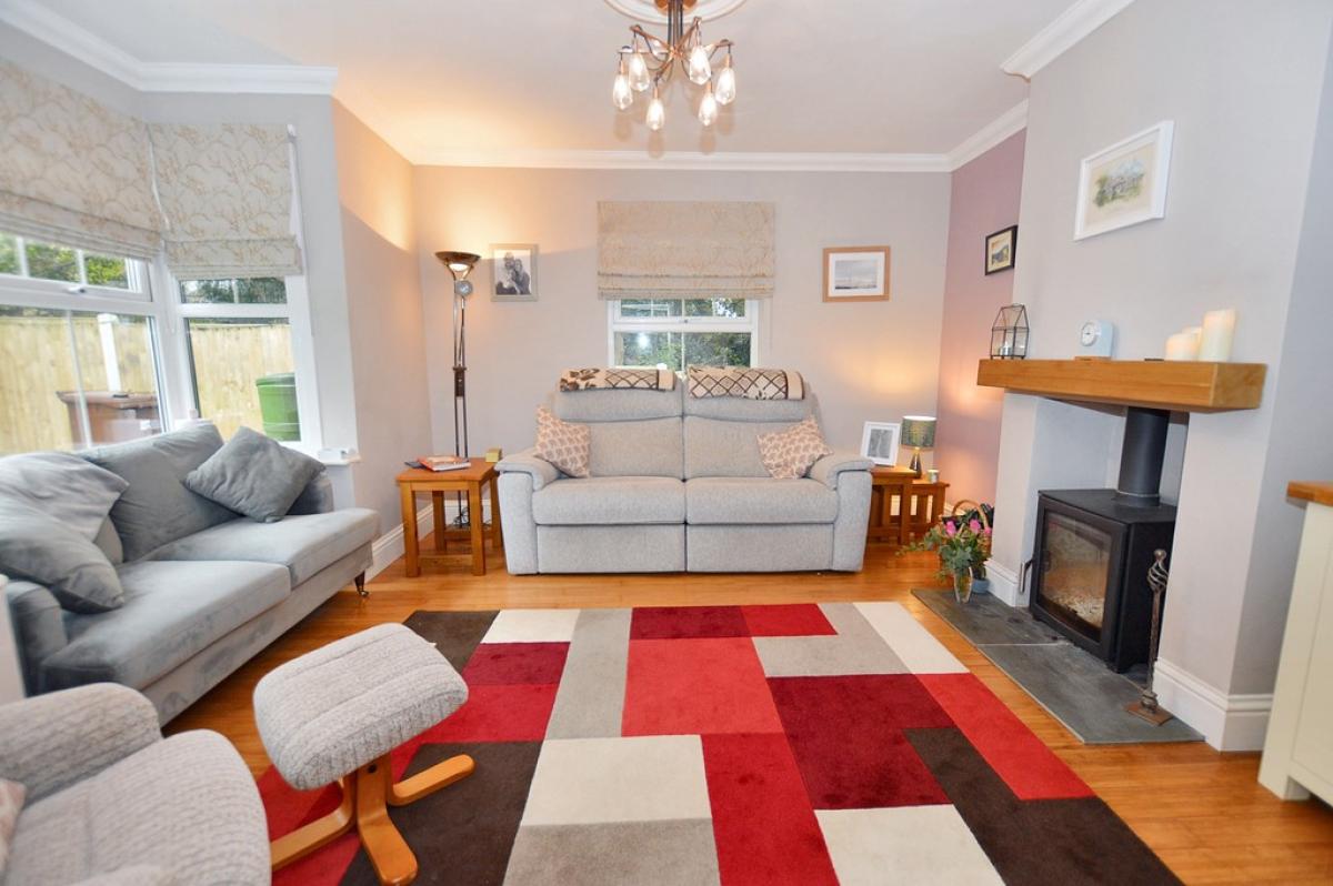 LOUNGE Dual aspect view, with UPVC double glazed bay window overlooking the gardens and further window to the side. Solid wood flooring, feature fireplace with inset freestanding wood burner on tiled hearth, half glazed sliding barn door. Ceiling light and rose.