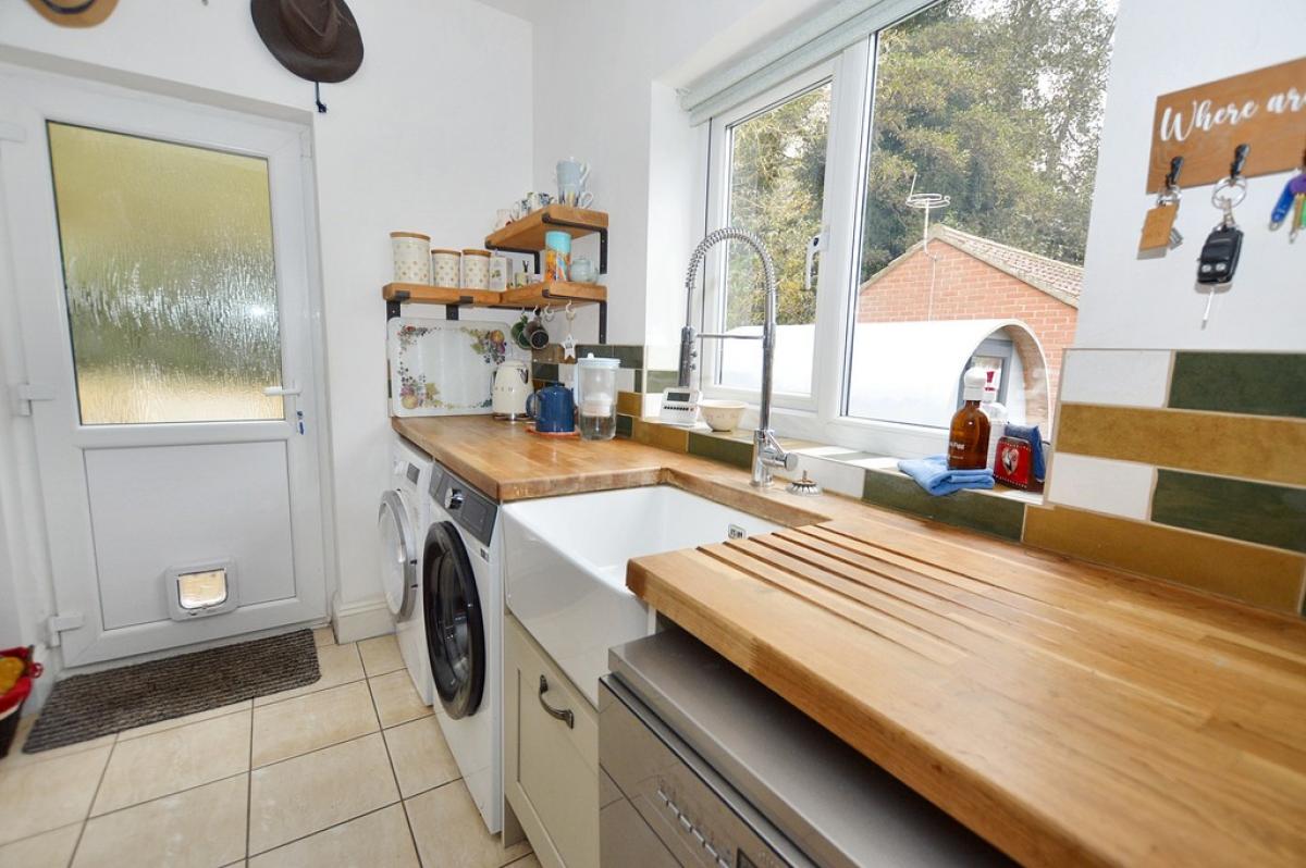 UTILITYROOM UPVC double glazed window to the front, solid wood work top with enamel butler sink and mixer tap over. Provision for washing machine, tumble dryer and dishwasher. Radiator, wall mounted gas central heating boiler, tiled floor, UPVC double glazed door to side access. Space for fridge freezer.