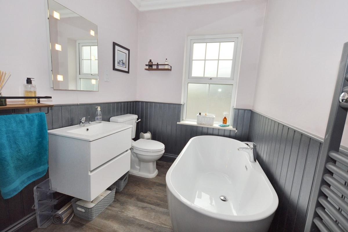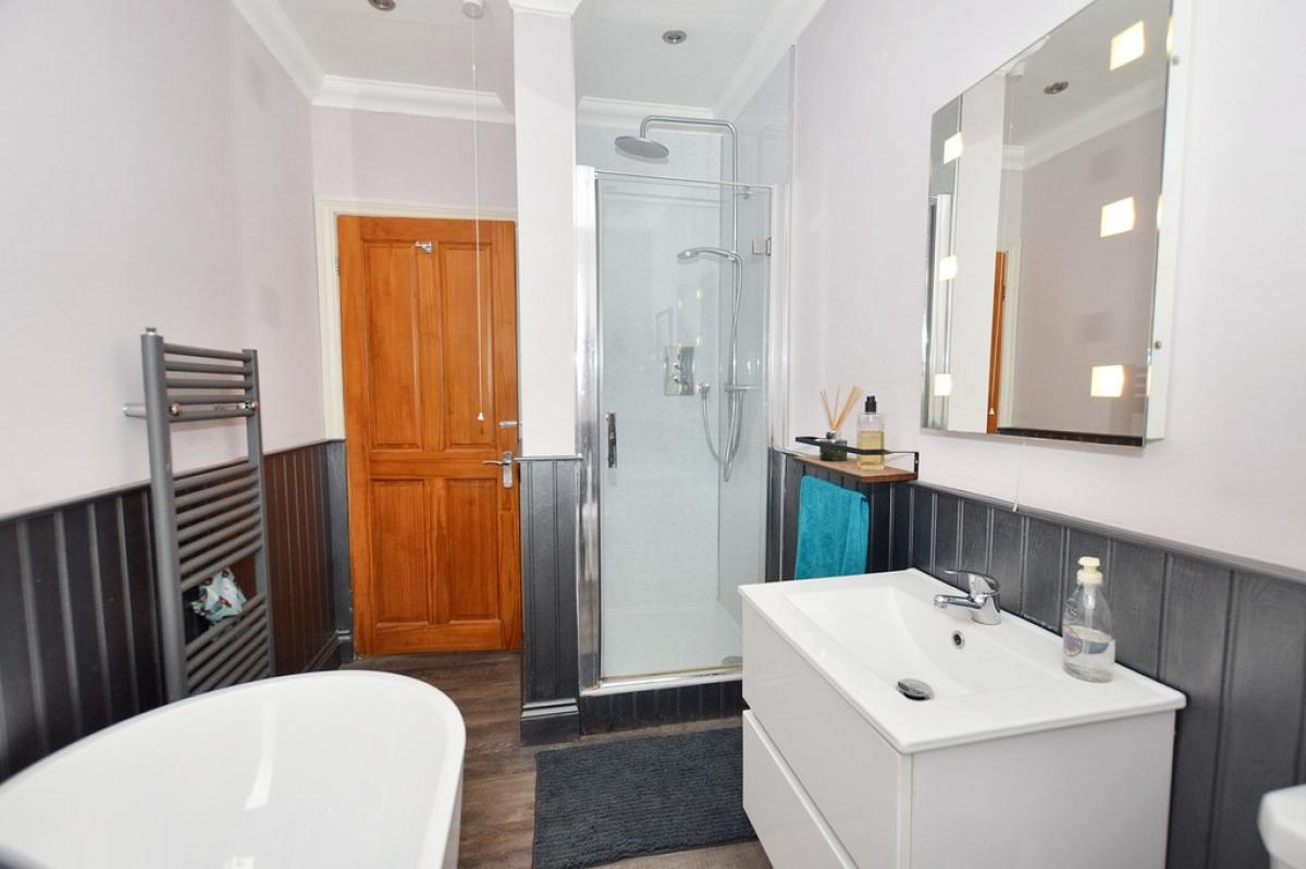 BATHROOM Stunning contemporary bathroom with double ended tub bath and central mixer tap, low level WC, wall mounted single hand basin with mixer tap, separate shower cubicle, with glazed door and double shower head, one being waterfall shower head. Wall mounted heated towel rail, half height wooden panelling. Extractor fan and LED spot lighting.