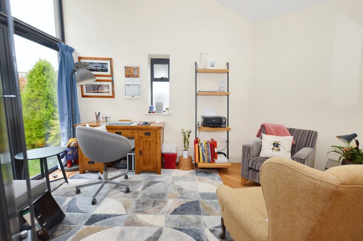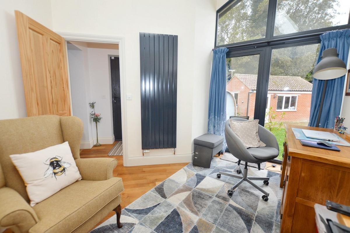 STUDY/BEDROOMFOUR Beautiful contemporary room with vaulted ceiling, UPVC double glazed full height floor to ceiling window with views over the front garden and entrance. Column radiator, solid wood flooring, obscure glazed UPVC double glazed window to the side. Velux roof light.