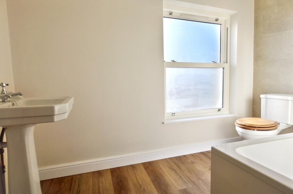 FAMILY BATHROOM Window to rear aspect, panelled bath with telephone style mixer tap and shower. Glass screen. Close coupled w.c., pedestal wash basin, chrome heated towel rail, part tiled walls.