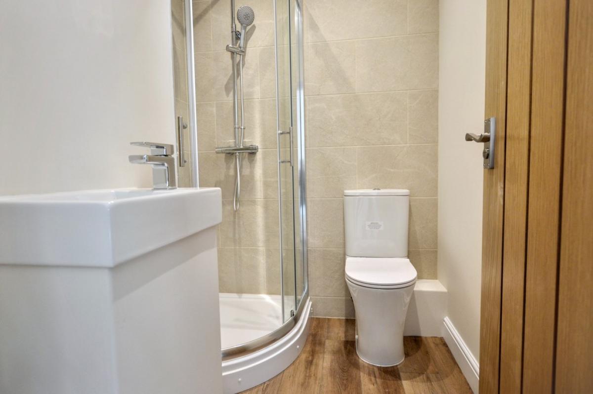 ENSUITE Corner shower enclosure with mixer shower, close coupled w.c., vanity wash basin, part tiled walls, chrome heated towel rail.