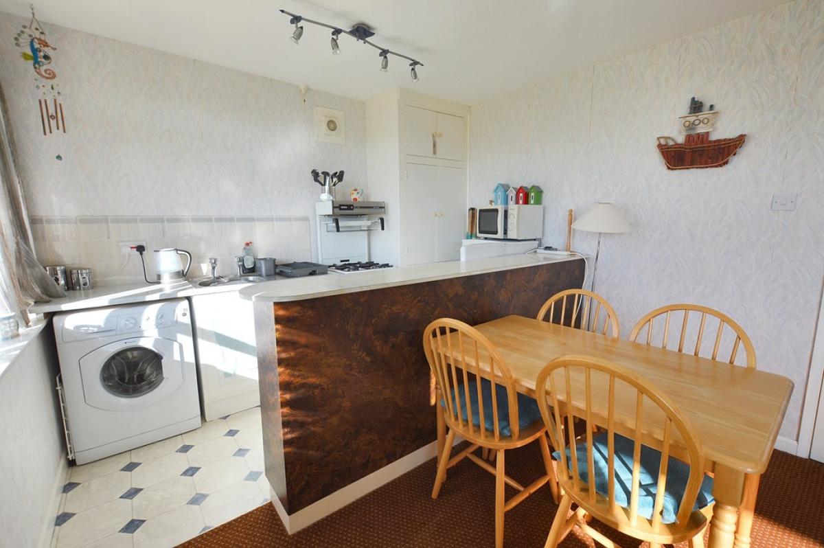 KITCHEN Large wooden window to the front, stainless steel sink unit with cupboard beneath, provision for washing machine, cooker and fridge. Large storage cupboard and breakfast bar with storage units beneath. Vinyl flooring, ceiling light, opens to