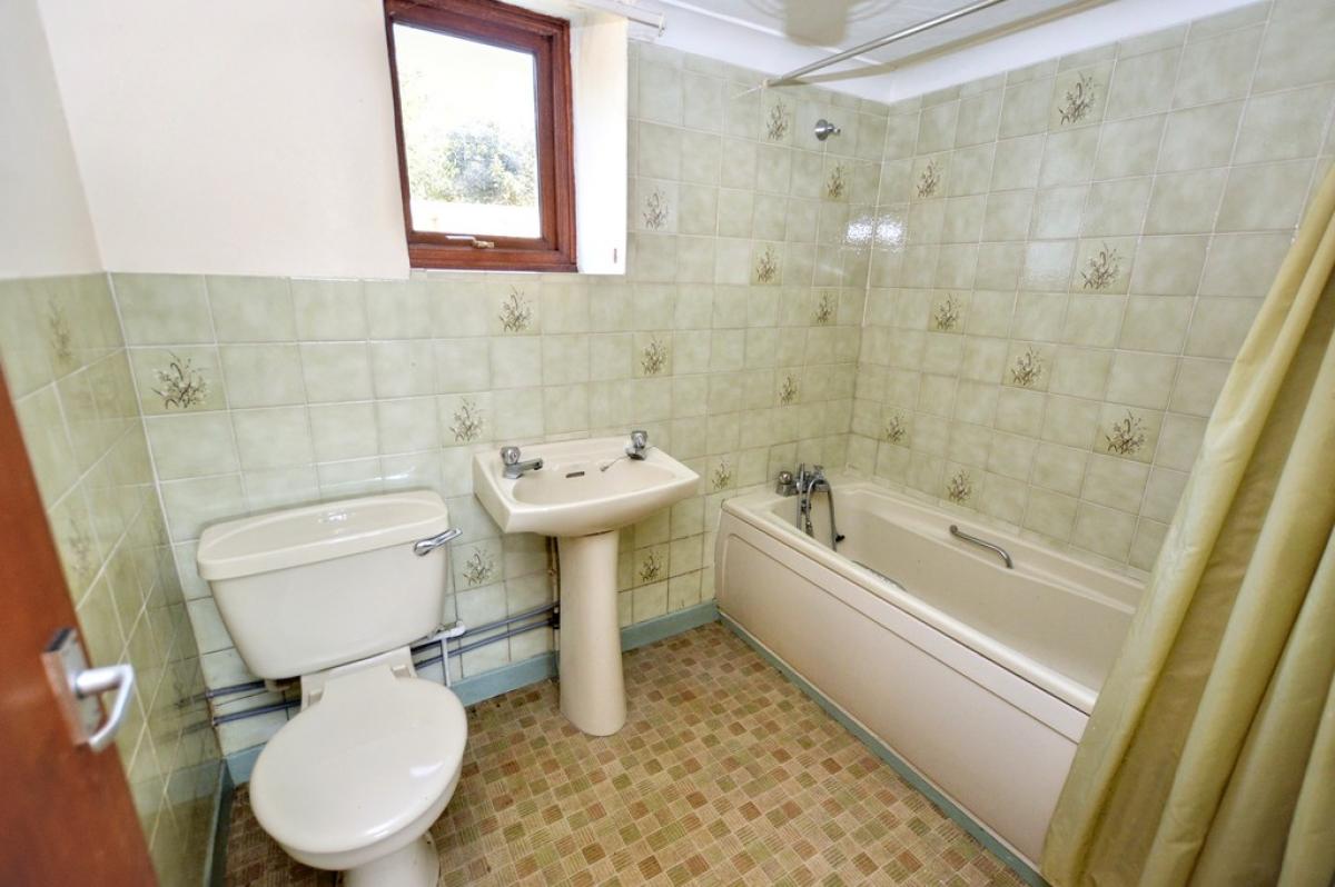 BATHROOM Panelled bath with mixer tap and shower attachment, close coupled w.c., pedestal wash basin, part tiled walls, electric shaver point and mirrored cabinet.