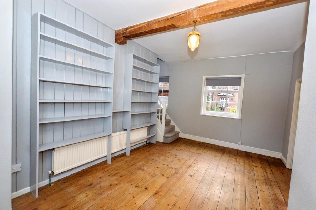 LOUNGE A beautifully light room with windows front and rear, double doors from dining area, polished wood floor, radiator, fitted shelving unit, provision for TV, turning stairs to first floor.