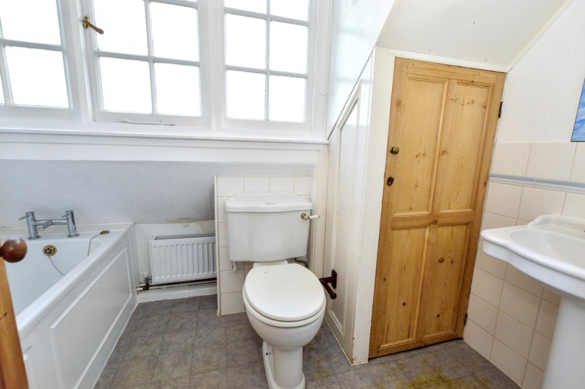 BATHROOM Panelled bath with electric shower and screen above, pedestal wash basin, close coupled w.c., fitted cupboard, part tiled walls, radiator, electric shaver point and mirror, window to front aspect, extractor fan.