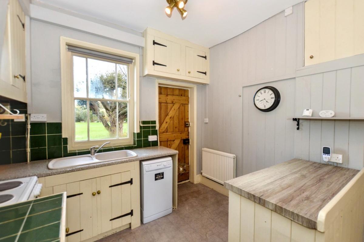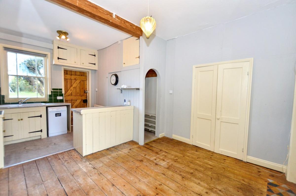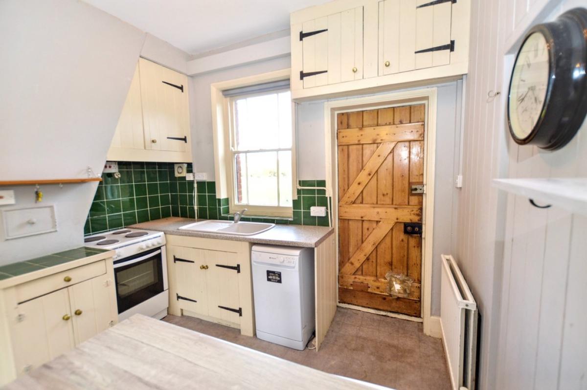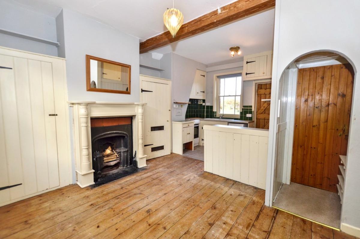 KITCHEN/DININGROOM Polished wood floor, windows front and rear, two radiators, feature fire surround with open fire if required, two fitted cupboards, one housing the gas fired boiler providing the central heating and domestic hot water. Range of cottage-style kitchen cabinets with laminated work surfaces and tiled splashbacks, inset sink unit, point for electric cooker, provision for washing machine and dishwasher, space for under counter refrigerator, door to front aspect. Archway to: