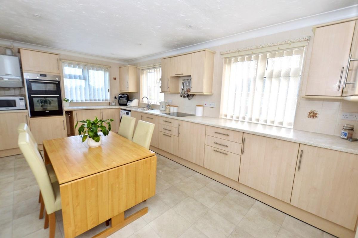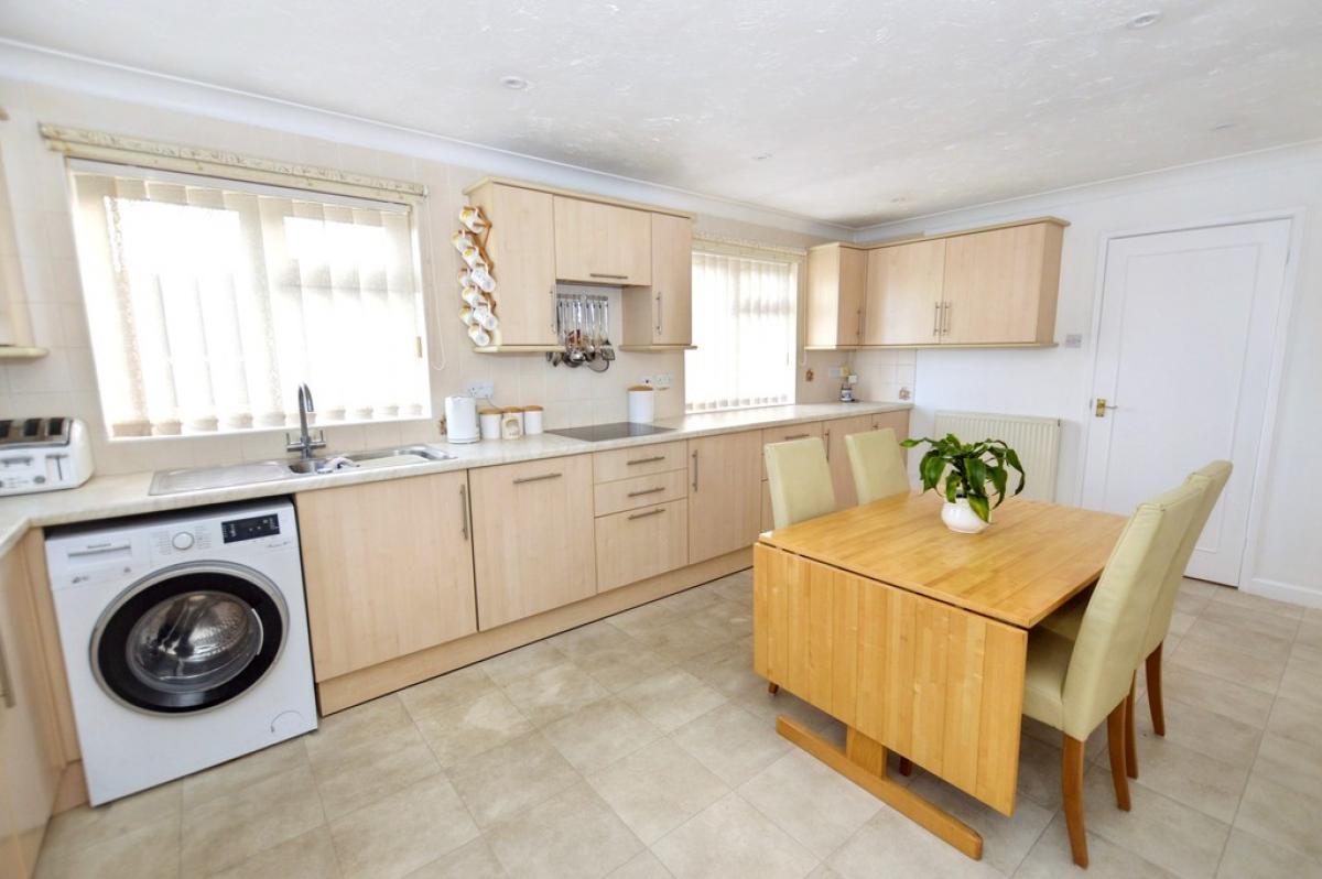 KITCHEN/DINER A beautifully light room with windows to front and side. Comprehensive range of base and wall cabinets with laminated work surfaces and tiled splashbacks, inset sink unit, inset ceramic hob with filter hood above, built in electric double oven, integrated dishwasher, provision for washing machine, wall mounted gas fired boiler providing central heating and domestic hot water, built in airing cupboard with lagged cylinder. Part glazed door to: