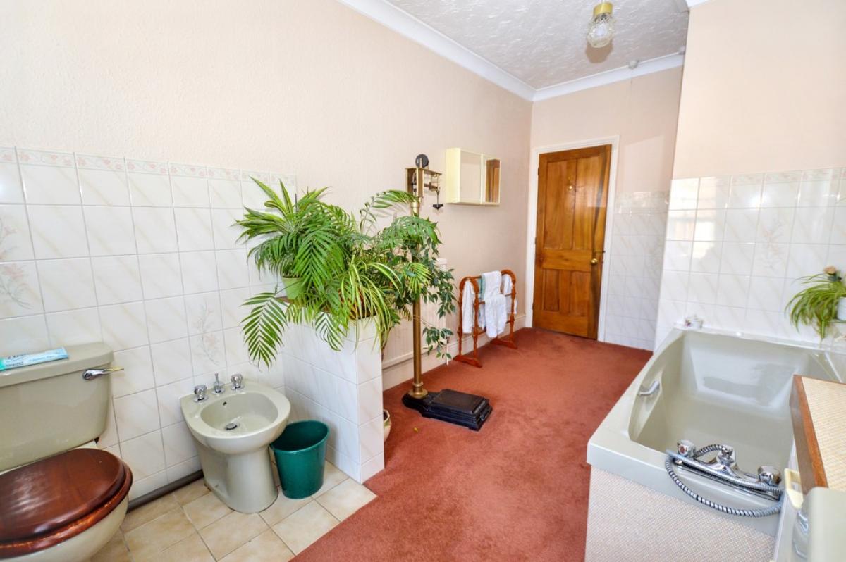 BATHROOM A large room with panelled bath, vanity washbasin with cupboards and drawers beneath, close coupled w.c., bidet, radiator, enclosed shower cubicle, part tiled walls.