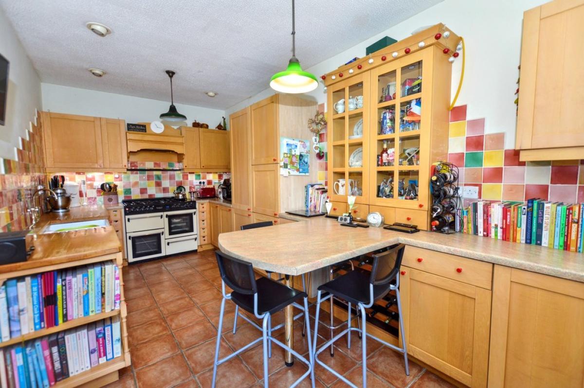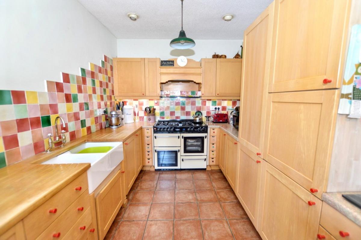 KITCHEN/BREAKFASTROOM Fitted with a comprehensive range of wood fronted base and wall cabinets with laminated work surfaces and tiled splashbacks. Built in breakfast bar, dual fuel range style cooker with filter hood above, double bowl Belfast Sink with mixer tap, integrated refrigerator and freezer, tiled floor, radiator, window to rear and door leading to: