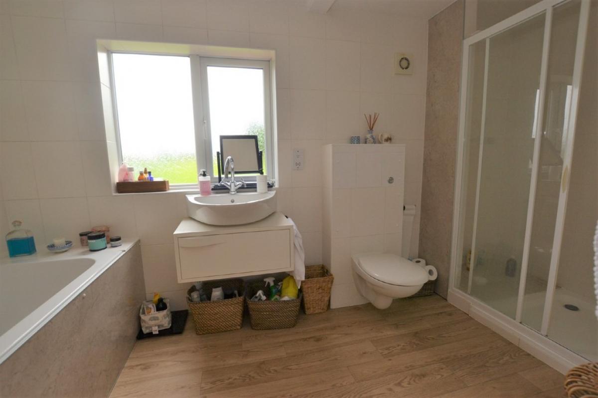 BATHROOM Modern white 4 piece suite to include bath, wash basin, WC and walk-in shower.
