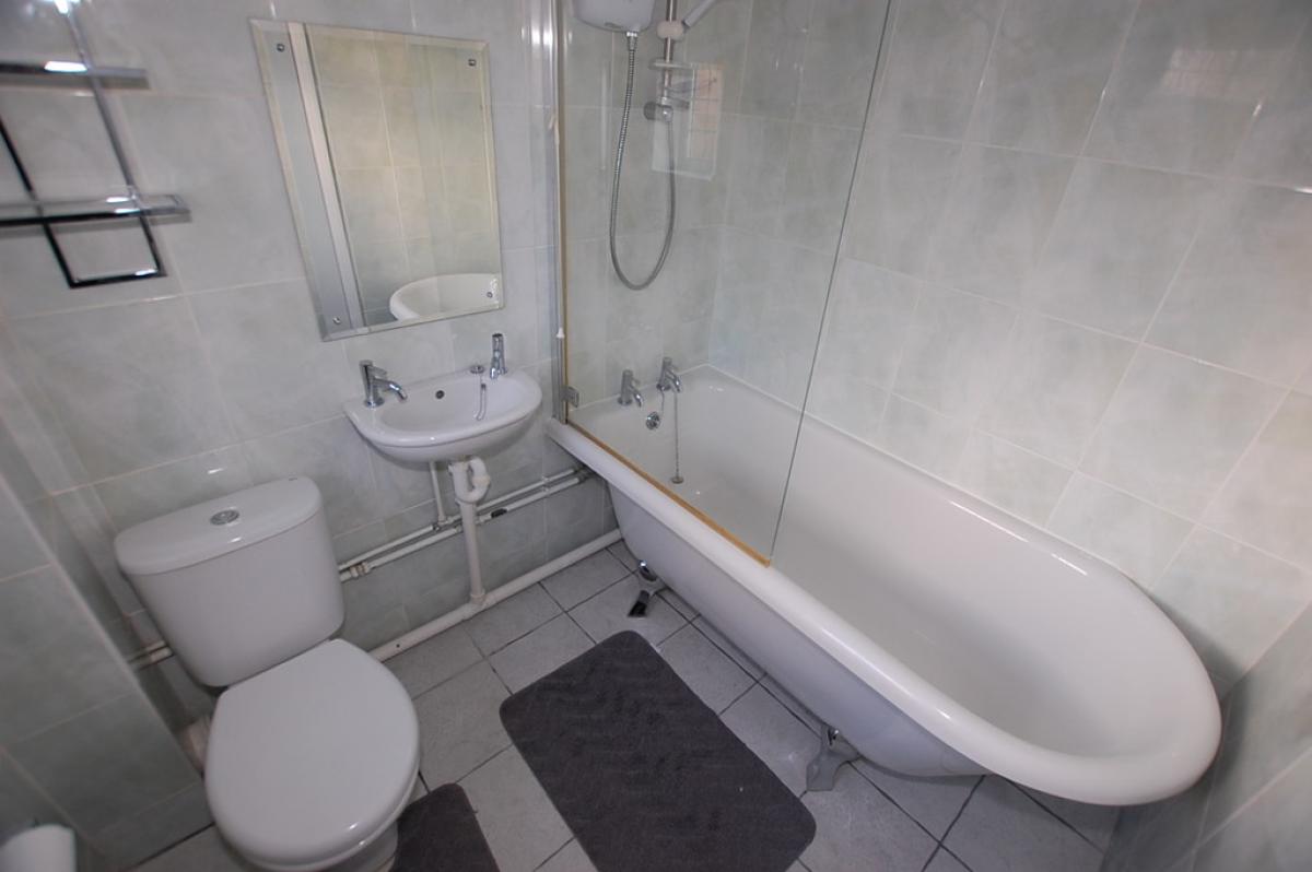 Bathroom Modern suite with roll top bath and shower over, wash basin and WC. Radiator, tiled floor and walls.