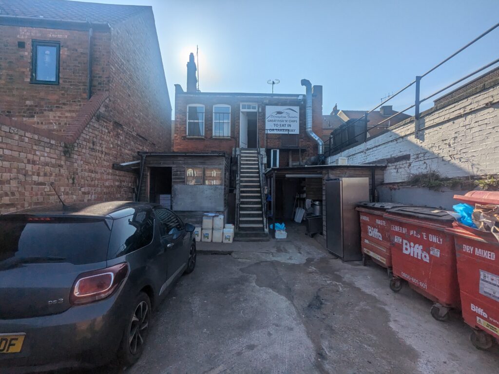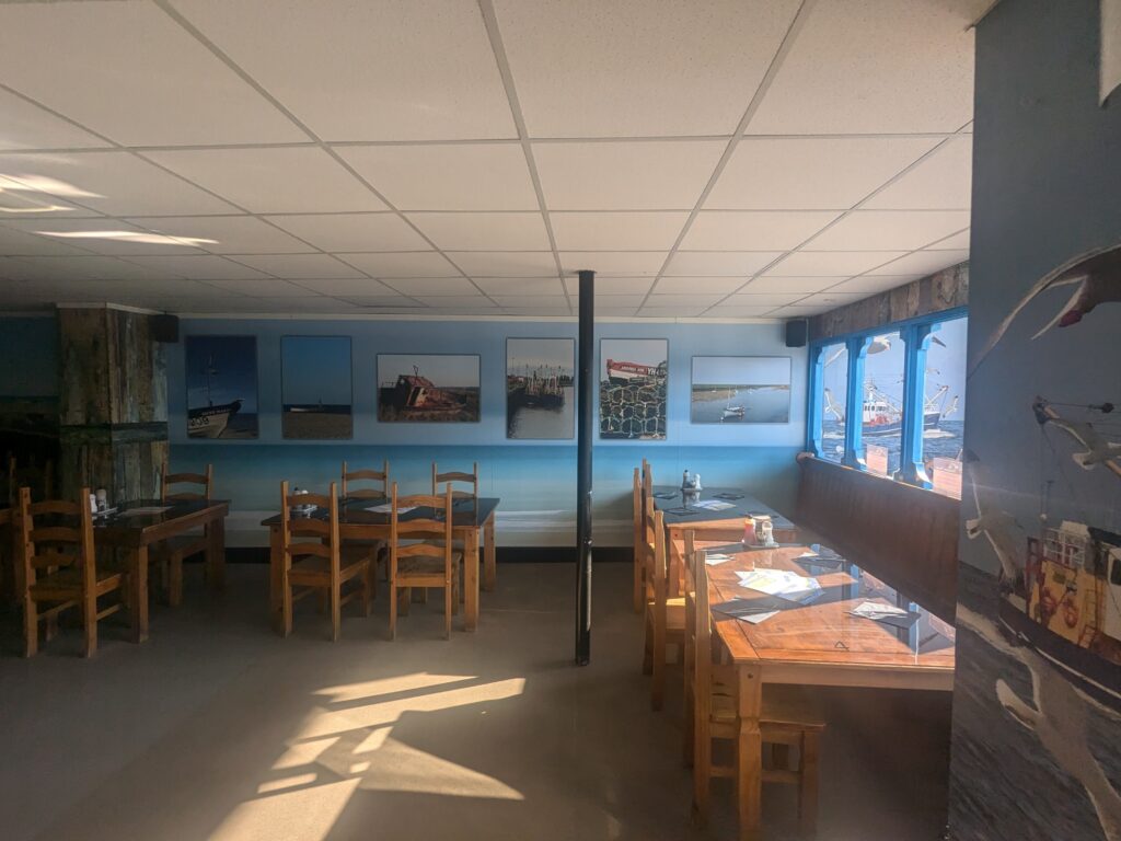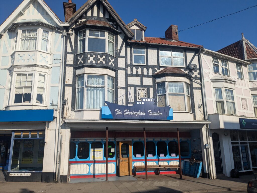 The ground floor is occupied by a restaurant trading as The Sheringham Trawler, with a distinctive, themed frontage incorporating a timber-framed shopfront and prominent signage.