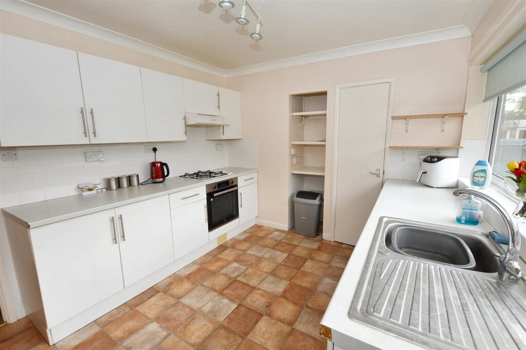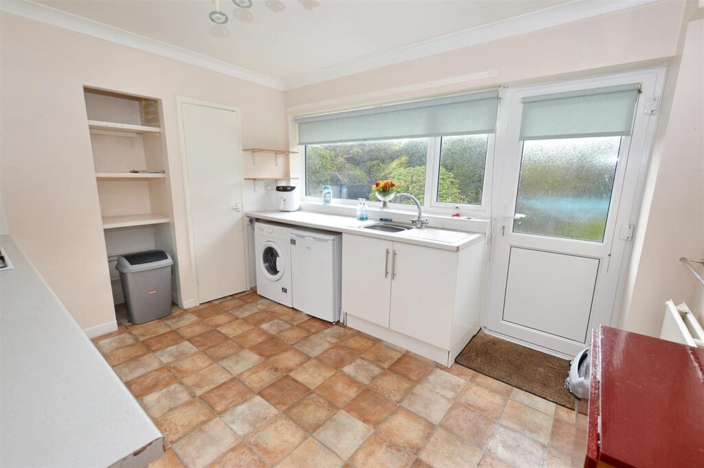 Window and glazed door to rear aspect. Range of base and wall cabinets with tiled splashbacks, inset gas hob with electric oven beneath, inset sink unit, provision for washing machine, radiator. Shelved recess and built in cupboard housing gas fired boiler providing central heating and domestic hot water.