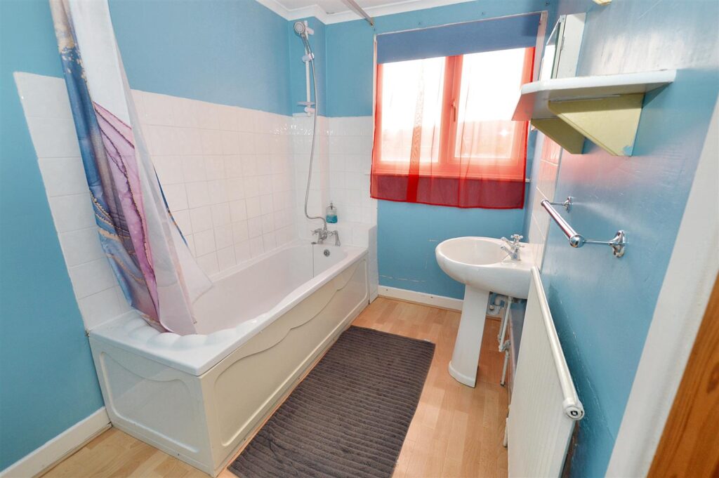 Panelled bath with mixer tap and shower attachment, pedestal wash basin, tiled splashbacks, radiator, window to rear aspect.