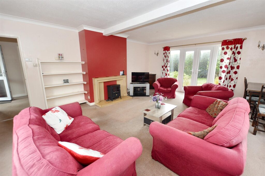 A lovely light room with windows to three aspects including French doors to the south. Feature stone fire surround with provision for electric stove, provision for TV, radiator.