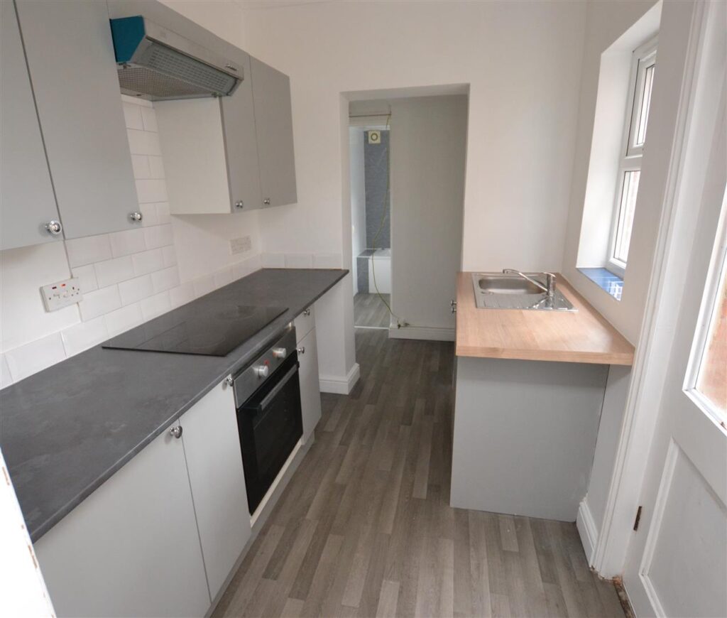 Good range of modern base and wall units with grey door fronts and ample work surfaces. Inset hob and oven. Inset sink. uPVC double glazed window. Vinyl flooring. Door to rear garden.