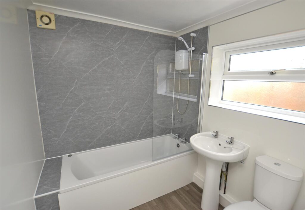 Modern white suite of bath with shower over, wash basin and WC. Radiator and uPVC double glazed window.