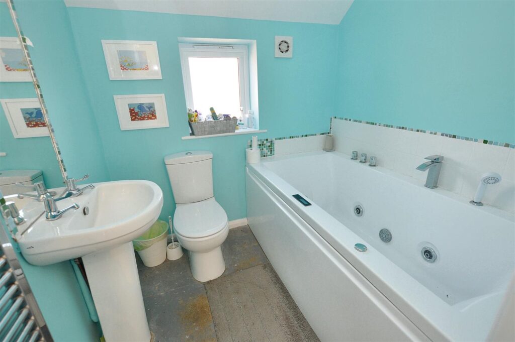 Window to side aspect, panelled jacuzzi bath, tiled splashback, close coupled w.c., pedestal wash basin, chrome heated towel rail.