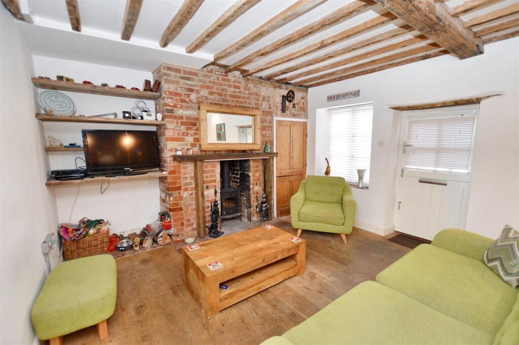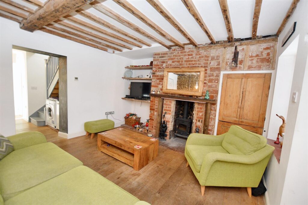 Part glazed stable door and window to front aspect, feature red brick chimney and fire surround housing wood burning stove with pamment stone hearth, alcove cupboard to the side, fitted shelving with provision for TV, exposed flint work and ceiling beams. Opening to: