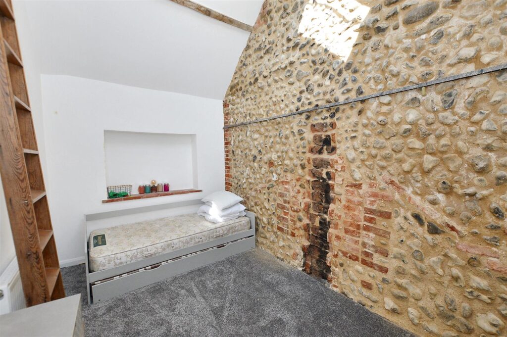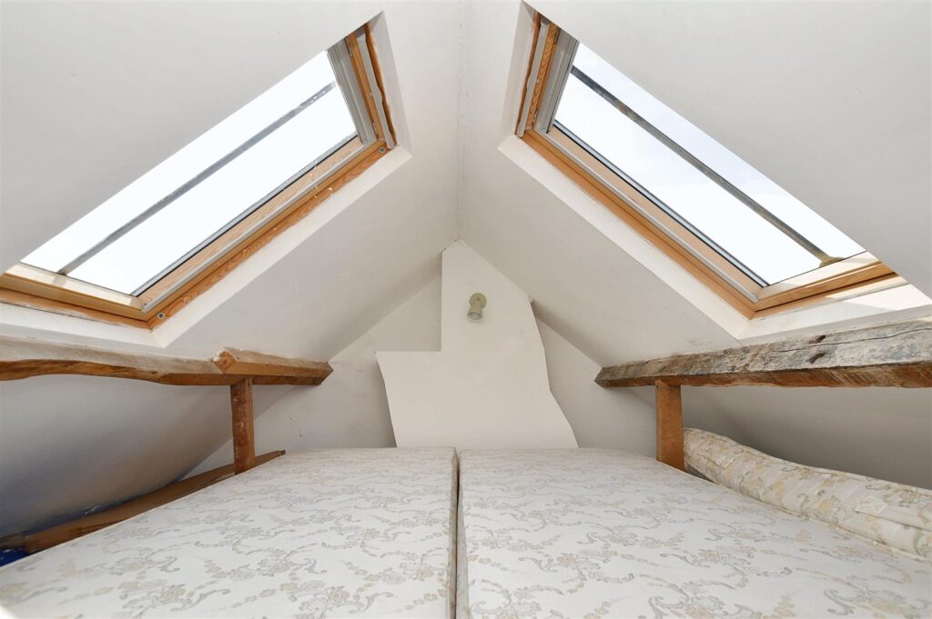 Velux roof light, radiator, exposed brick and flint wall, exposed roof timbers, fixed step ladder leading to: