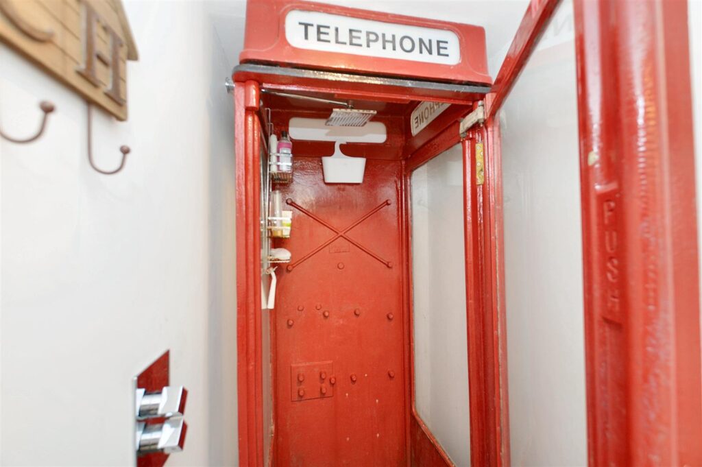 Cleverly converted from an old red telephone kiosk housing a mixer shower with tiled floor.