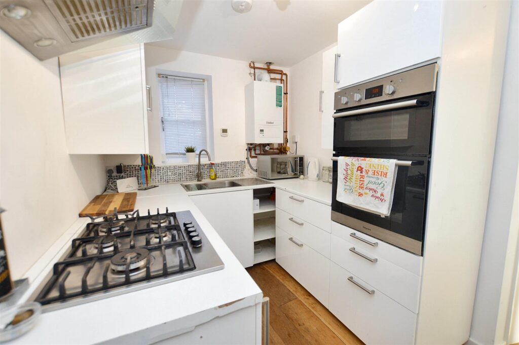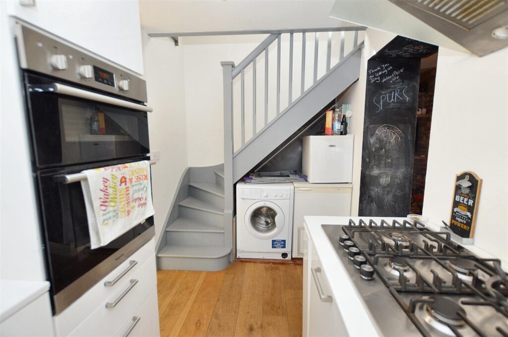 With turning staircase to first floor, with understairs recess. Comprehensive range of high gloss base and wall cabinets with laminated work surfaces, mosaic tiled splashback, inset sink unit, inset five ring gas hob with stainless steel filter above, built in electric oven, wall mounted gas fired boiler providing central heating and domestic hot water. Window to side aspect. A small lobby then leads to: