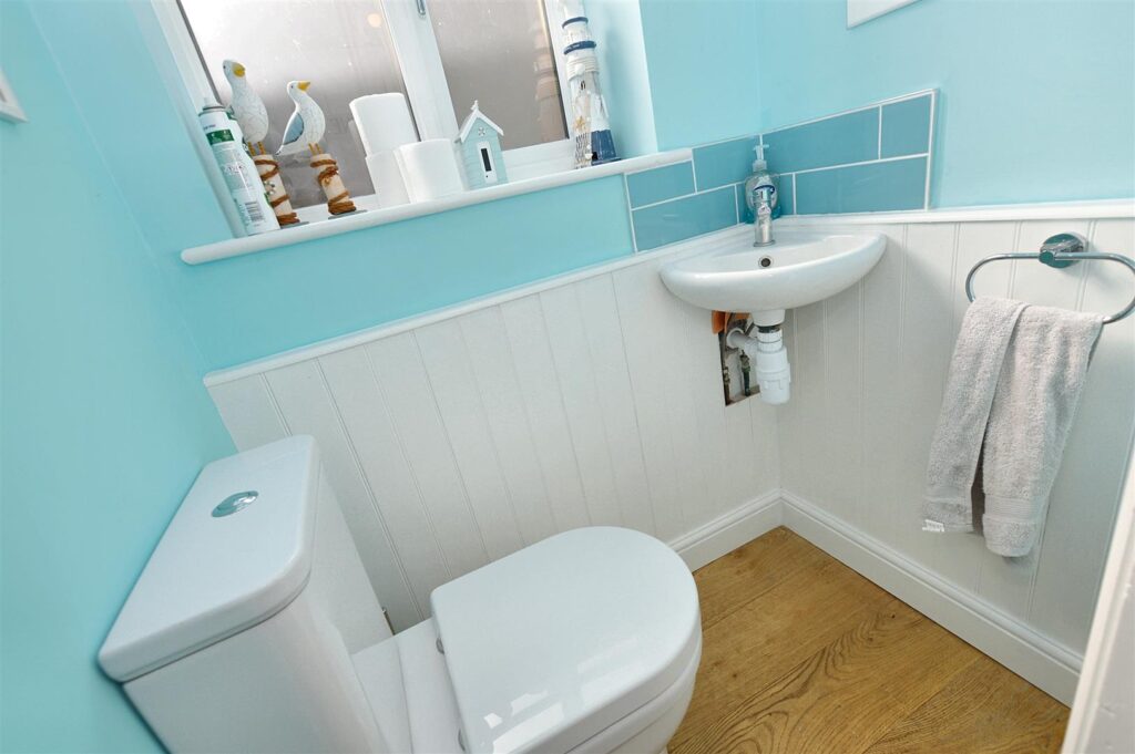 With corner wash basin, close coupled w.c., part panelled walls, tiled splashback, window to side aspect.