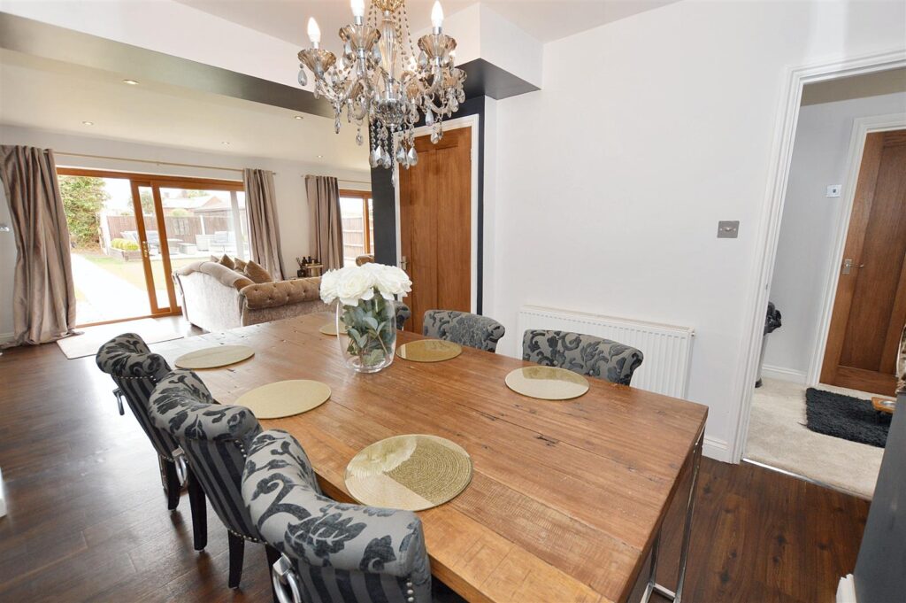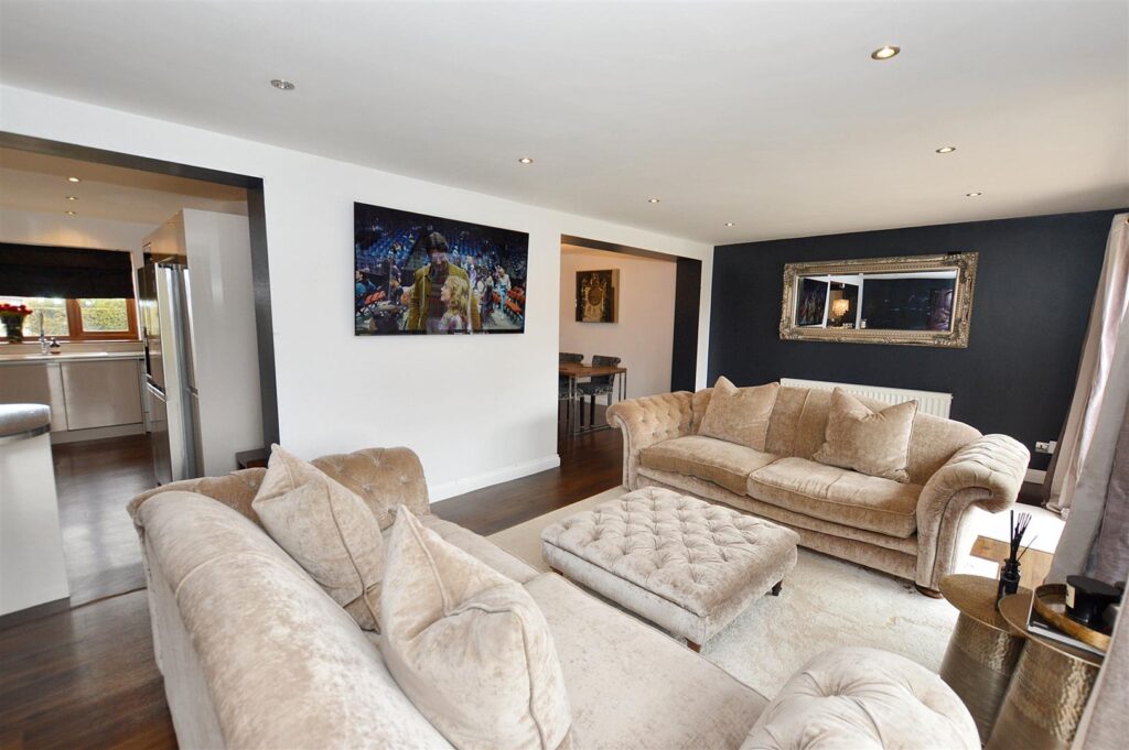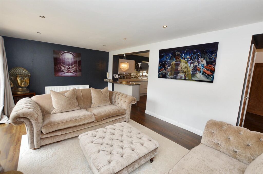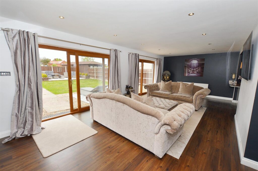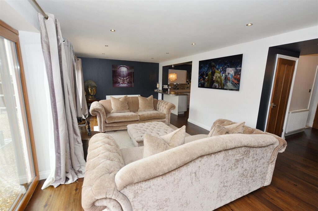 Continuation of wood laminate floor, two large sets of patio doors opening to the rear patio and garden, two radiators, provision for wall mounted TV, recessed ceiling spot lighting. Open plan design leading to: